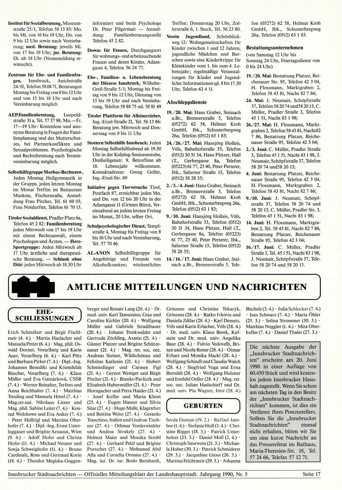 Innsbrucker Stadtnachrichten — Offizielles Mitteilungsblatt der Landeshauptstadt. Jahrgang 1990, Nr. 5
