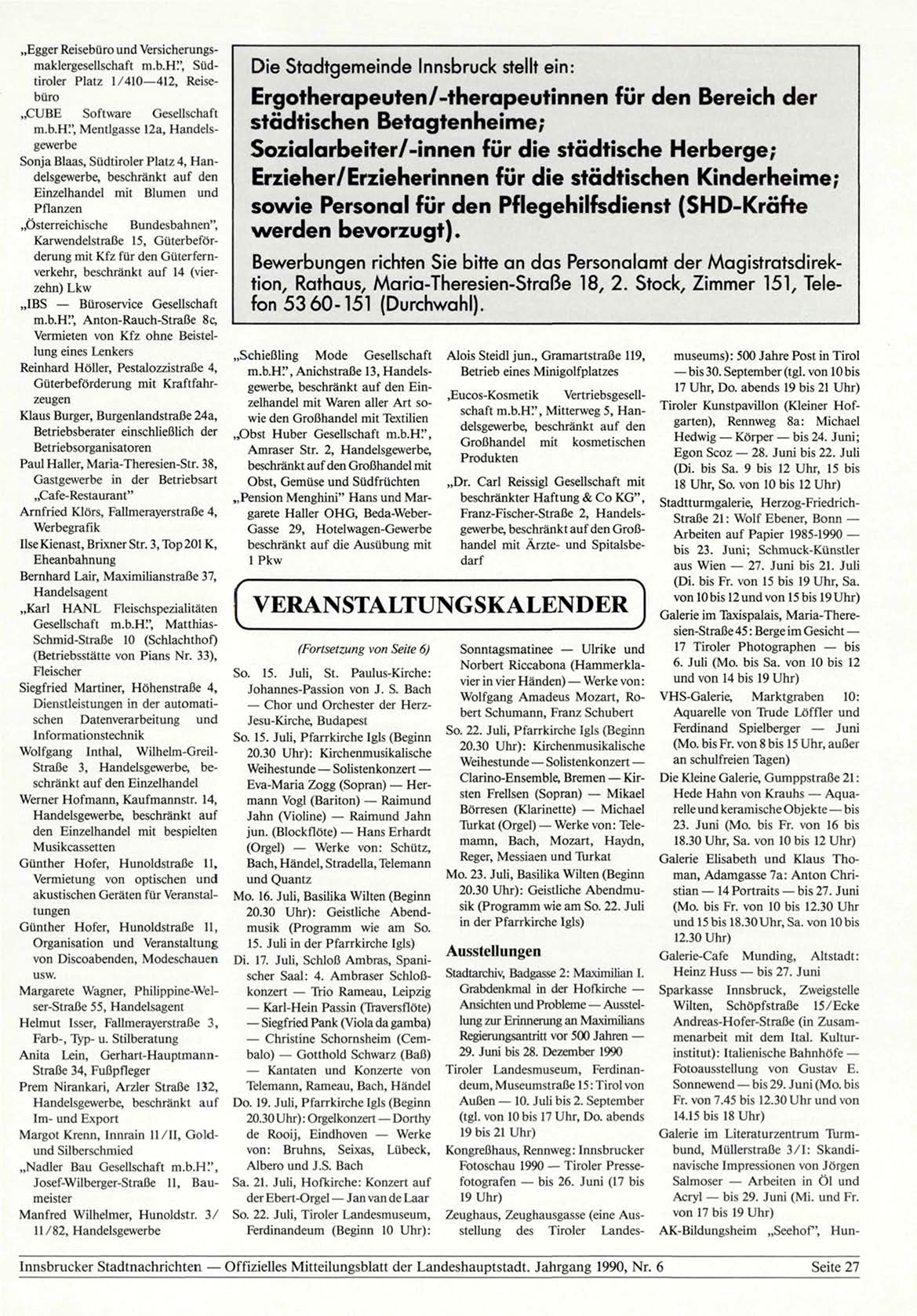 Innsbrucker Stadtnachrichten — Offizielles Mitteilungsblatt der Landeshauptstadt. Jahrgang 1990, Nr. 6