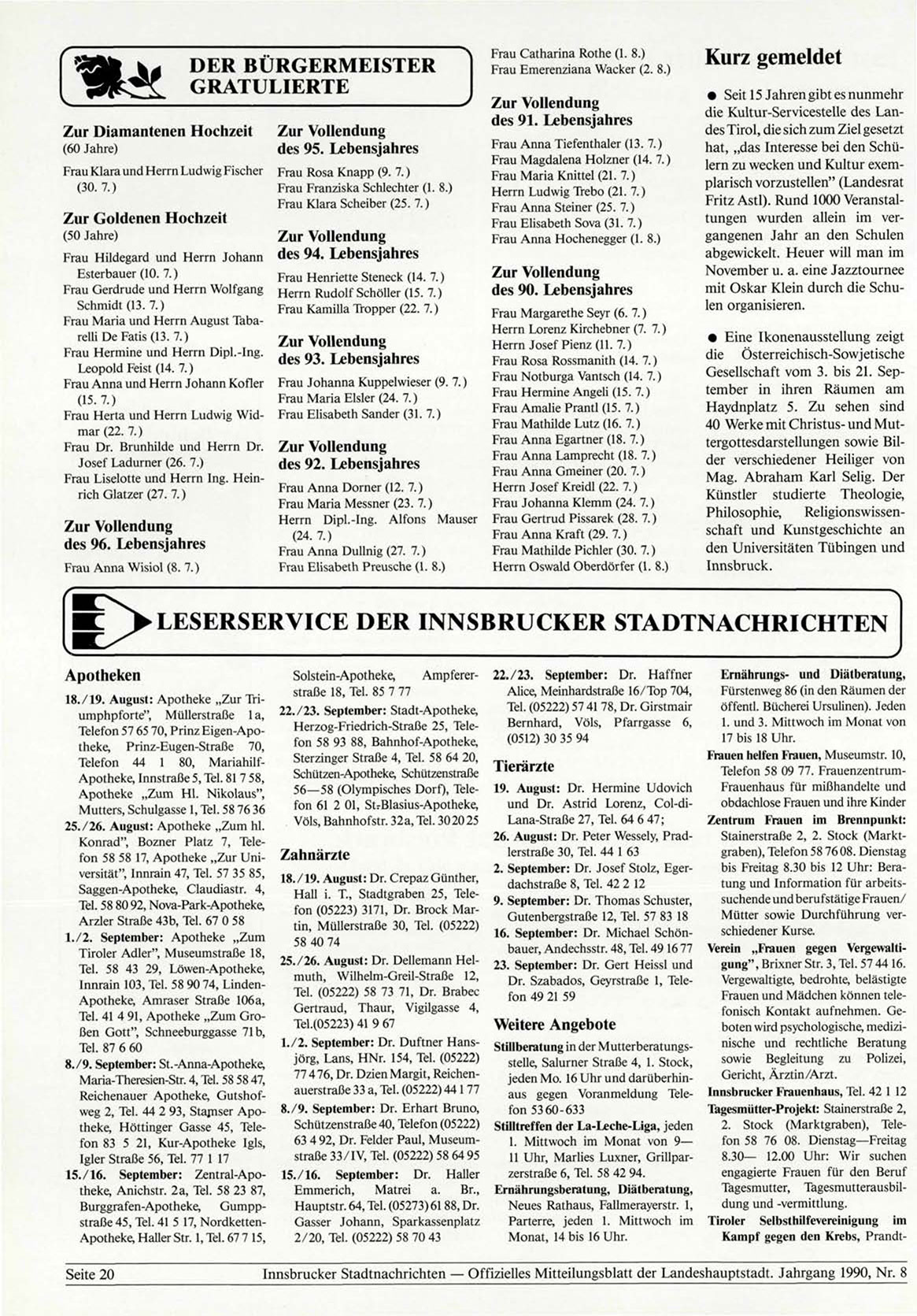 Innsbrucker Stadtnachrichten — Offizielles Mitteilungsblatt der Landeshauptstadt. Jahrgang 1990, Nr. 8