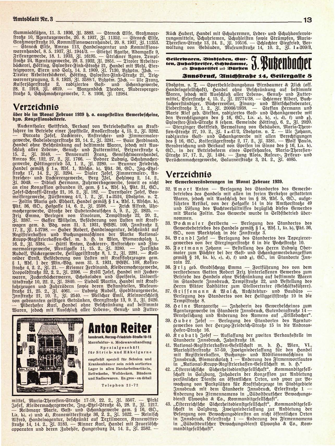 schluß aller Lebens-, Genuß- und Futtermittel, Brixnerstraße 4, GO., in der Betriebsform eines Speisehauses, Maria-Theresien15. 2.. Z l . 3048. — Venvenutti Franz, Gemischtwarenhandel, Straße 57, 17. 2.. Zl. 1494. — Jung Alois, Raseur-, Friseur- und