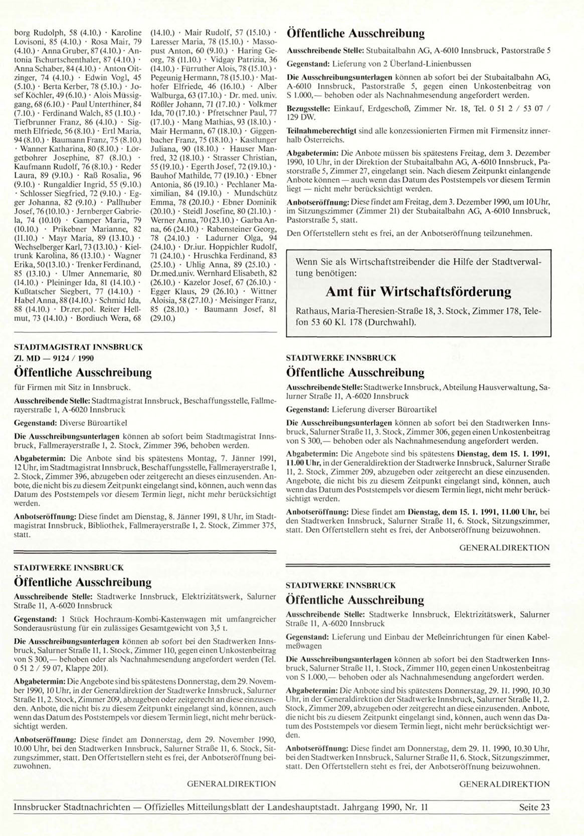 Abgabetermin: Die Angebote sind bis spätestens Donnerstag, dem 29. November 1990, 10 Uhr, in der Generaldirektion der Stadtwerke Innsbruck, Salurner Abgabetermin: Die Anbote sind bis spätestens Donnerstag, 29. 11. 1990, 10.30