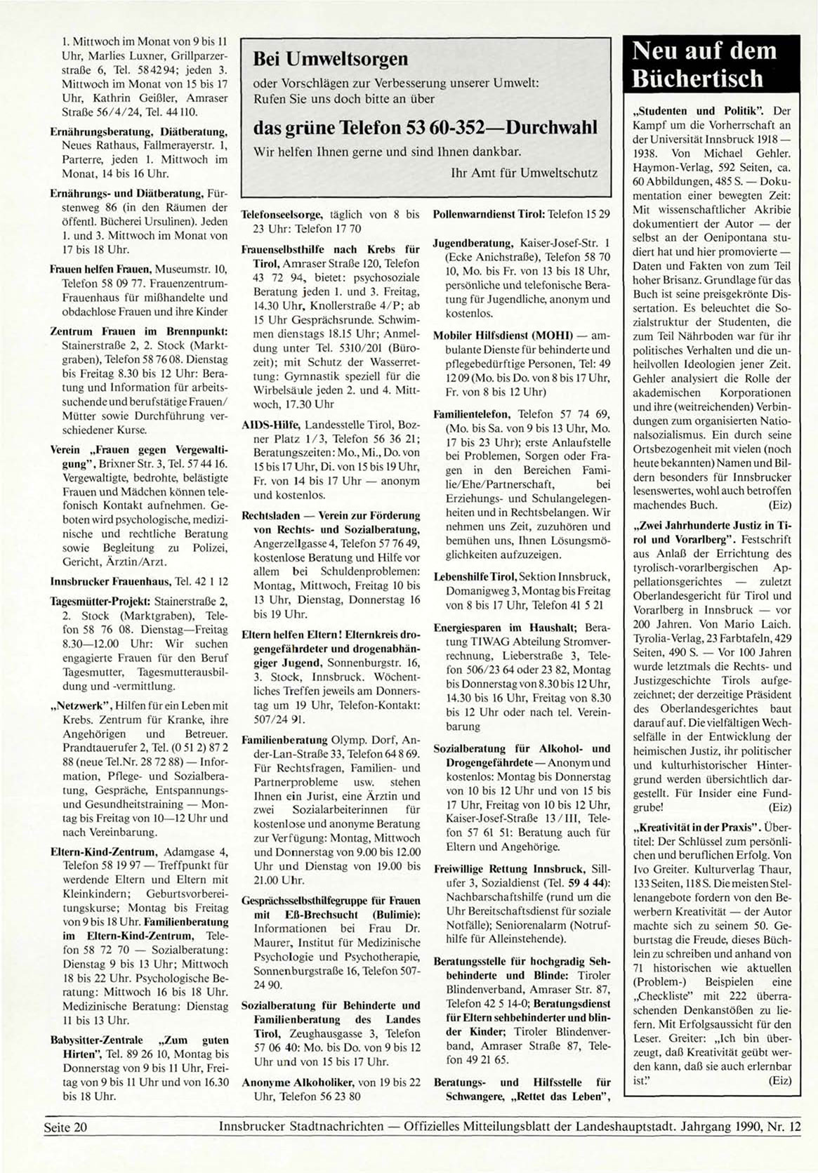 Innsbrucker Stadtnachrichten — Offizielles Mitteilungsblatt der Landeshauptstadt. Jahrgang 1990, Nr. 12