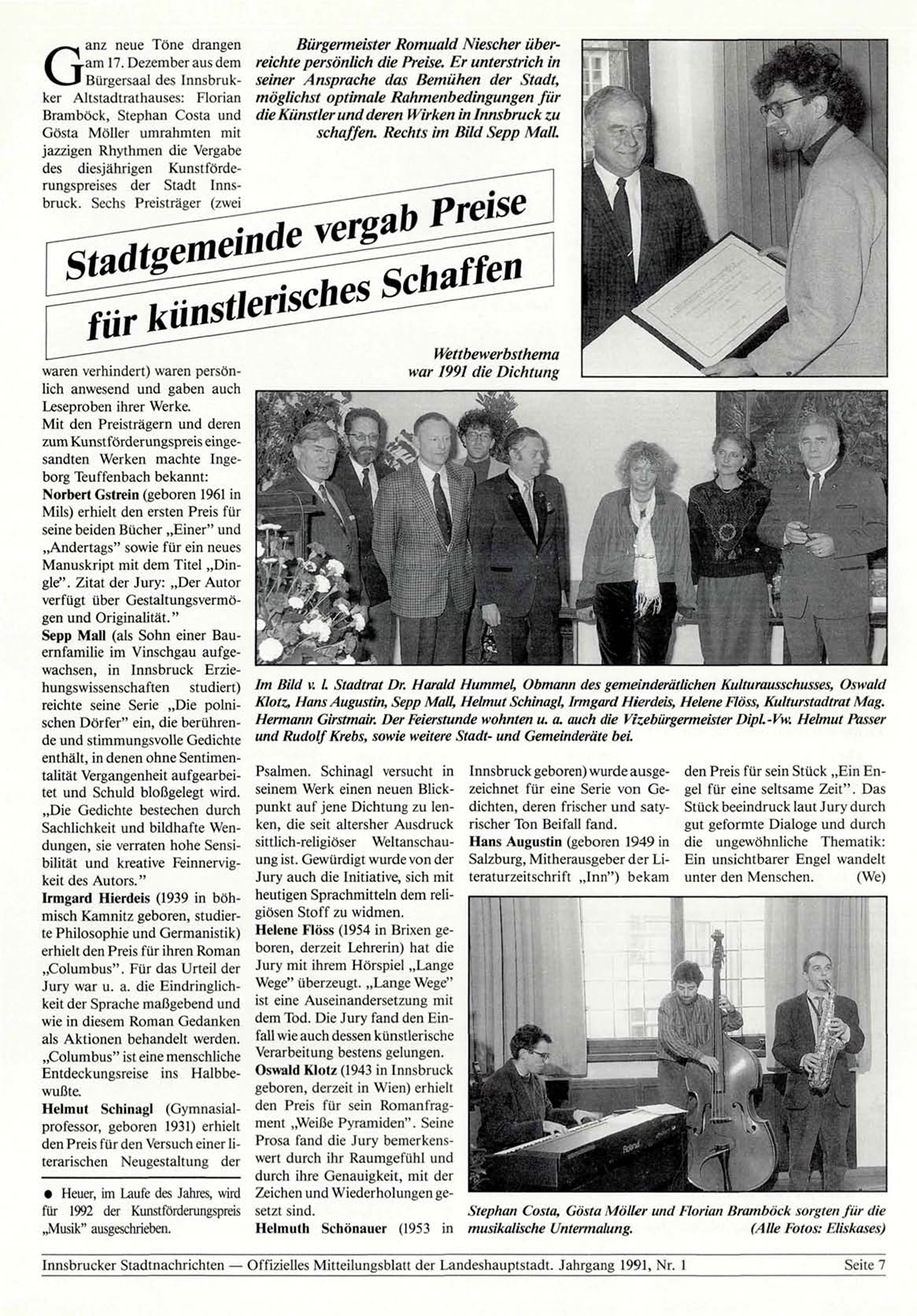 Innsbrucker Stadtnachrichten — Offizielles Mitteilungsblatt der Landeshauptstadt. Jahrgang 1991, Nr. 1