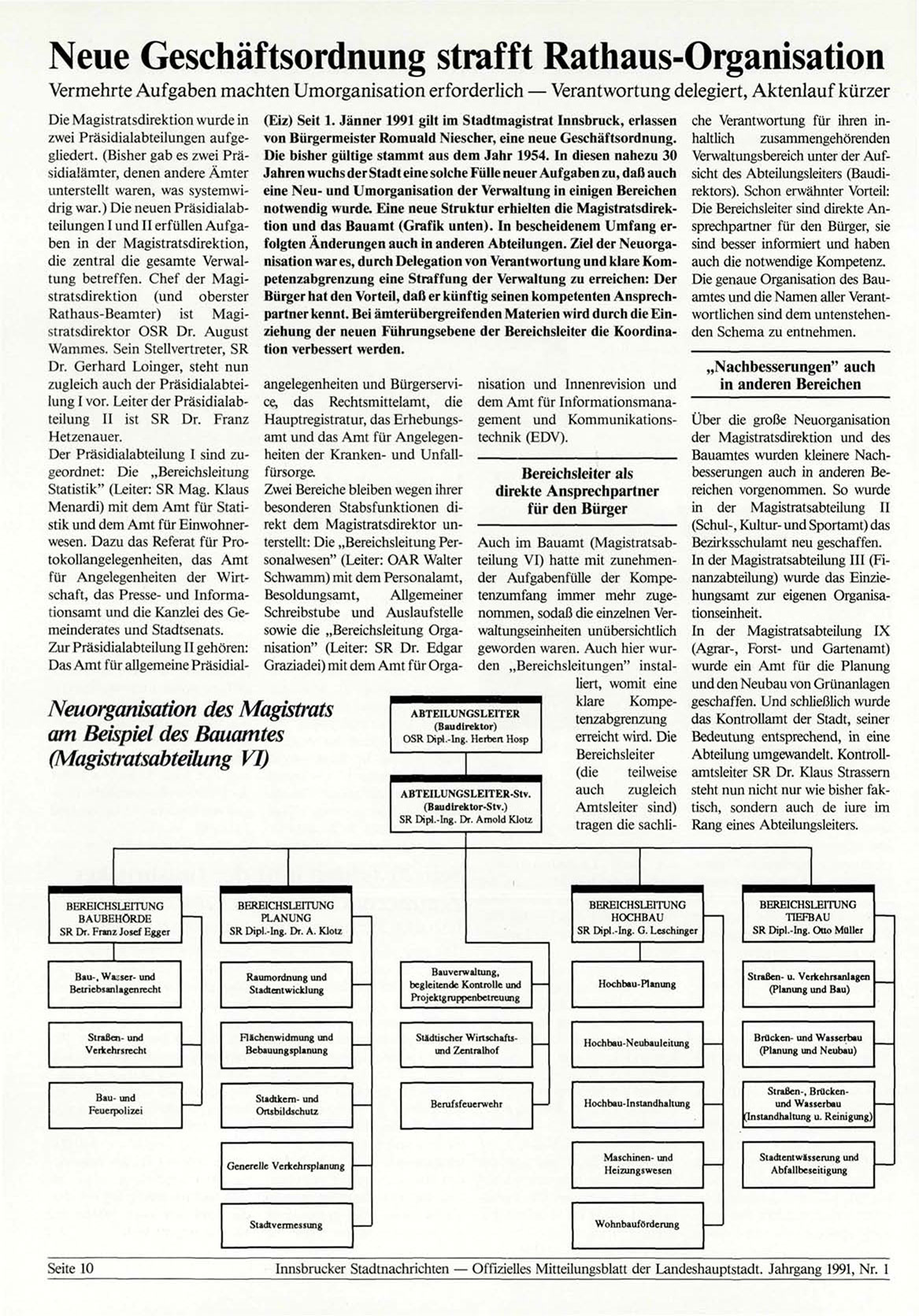 notwendig wurde. Eine neue Struktur erhielten die Magistratsdirektion und das Bauamt (Grafik unten). In bescheidenem Umfang erfolgten Änderungen auch in anderen Abteilungen. Ziel der Neuorganisation wares, durch Delegation von Verantwortung und klare Kompetenzabgrenzung eine Straffung der Verwaltung zu erreichen: Der