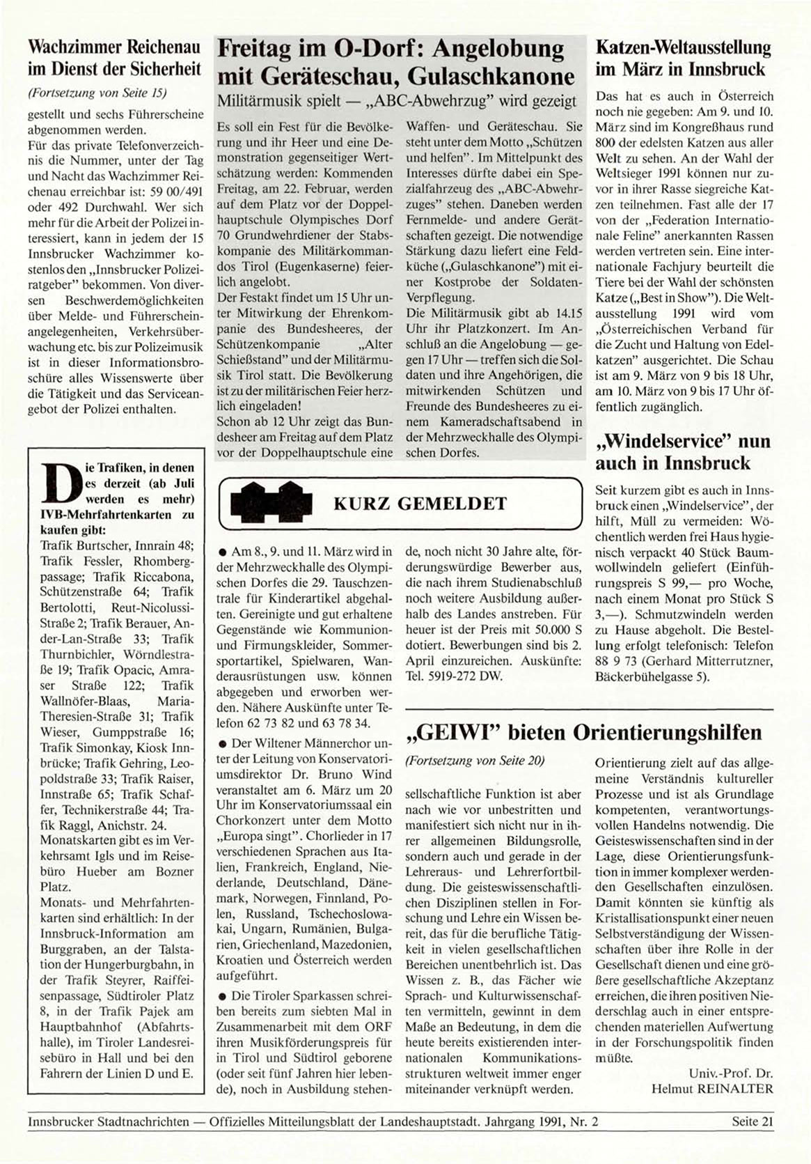 Innsbrucker Stadtnachrichten — Offizielles Mitteilungsblatt der Landeshauptstadt. Jahrgang 1991, Nr. 2
