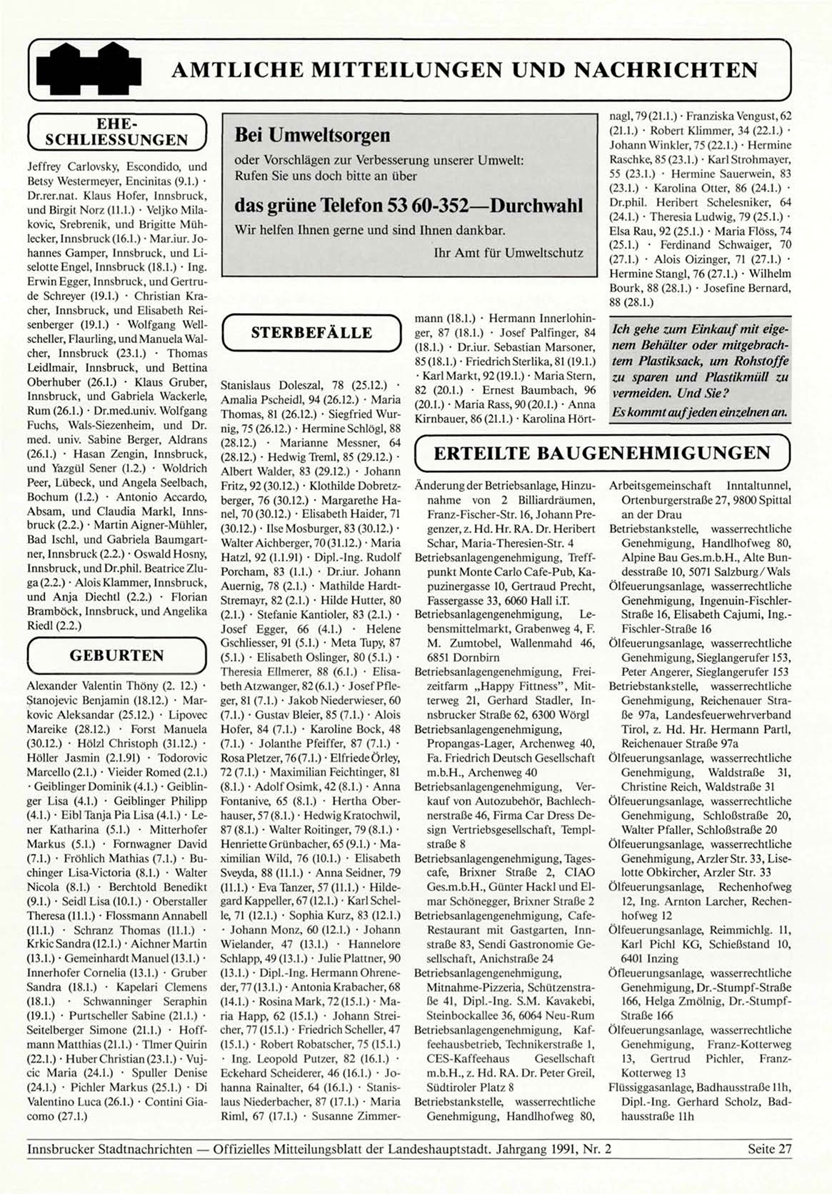 Innsbrucker Stadtnachrichten — Offizielles Mitteilungsblatt der Landeshauptstadt. Jahrgang 1991, Nr. 2