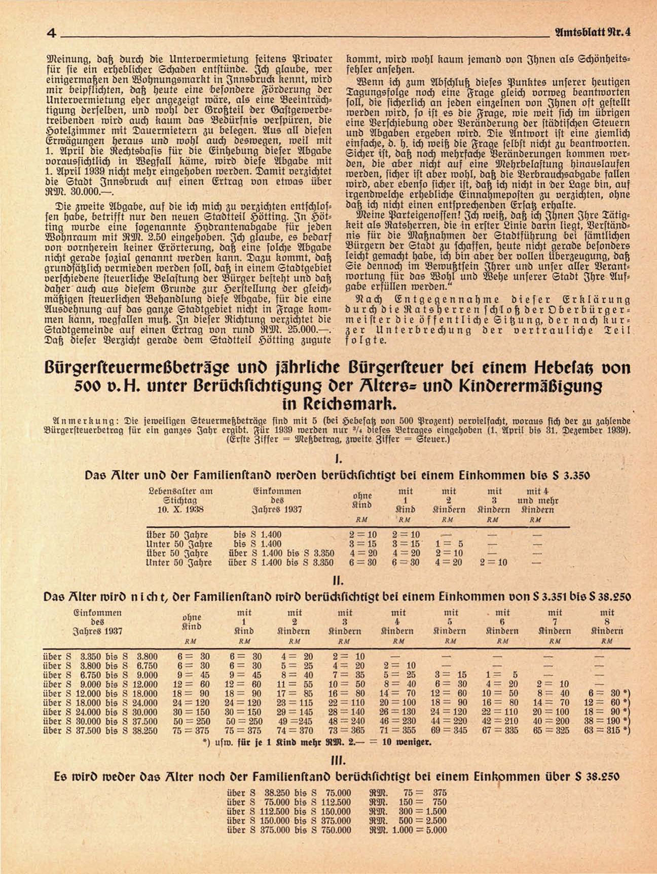 Bürgersteuerbetrag für ein ganzes Jahr ergibt. Für 1939 werden nur V< dieses Betrages eingehoben (1. April bis 31. Dezember 1939).