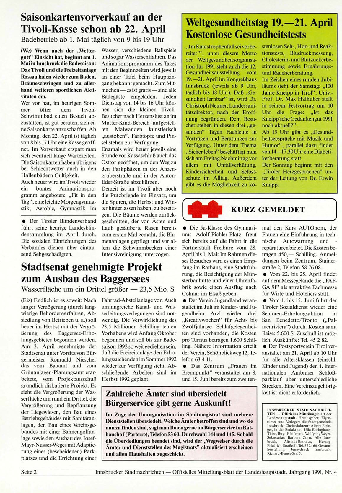 Innsbrucker Stadtnachrichten — Offizielles Mitteilungsblatt der Landeshauptstadt. Jahrgang 1991, Nr. 4