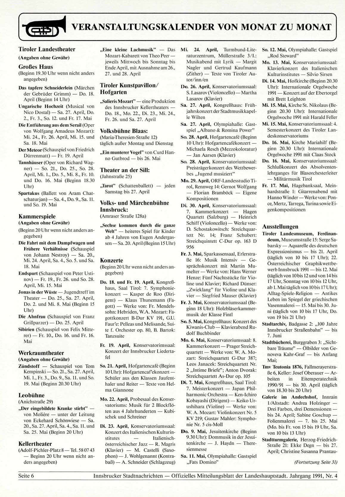 Innsbrucker Stadtnachrichten — Offizielles Mitteilungsblatt der Landeshauptstadt. Jahrgang 1991, Nr. 4