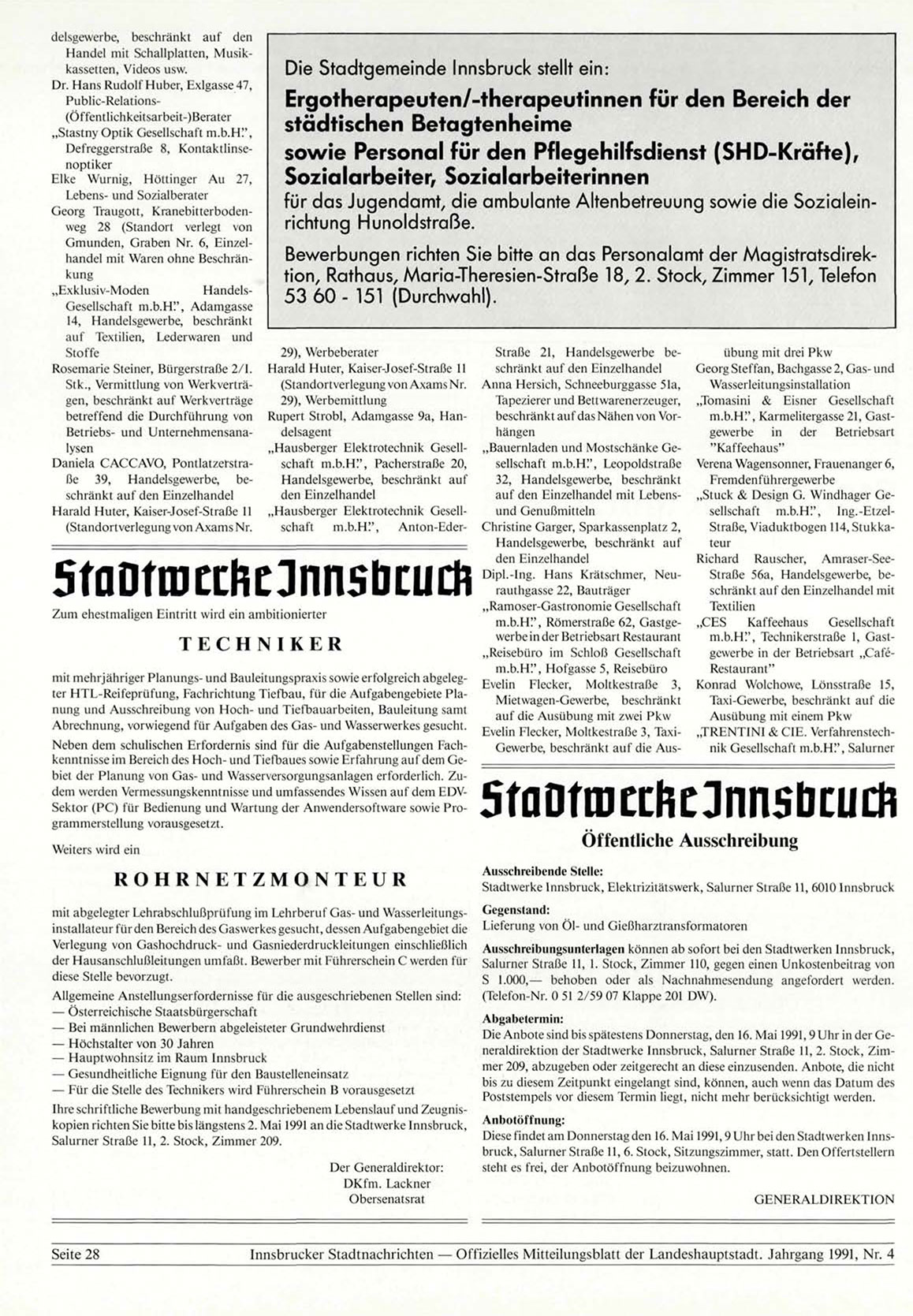 Innsbrucker Stadtnachrichten — Offizielles Mitteilungsblatt der Landeshauptstadt. Jahrgang 1991, Nr. 4