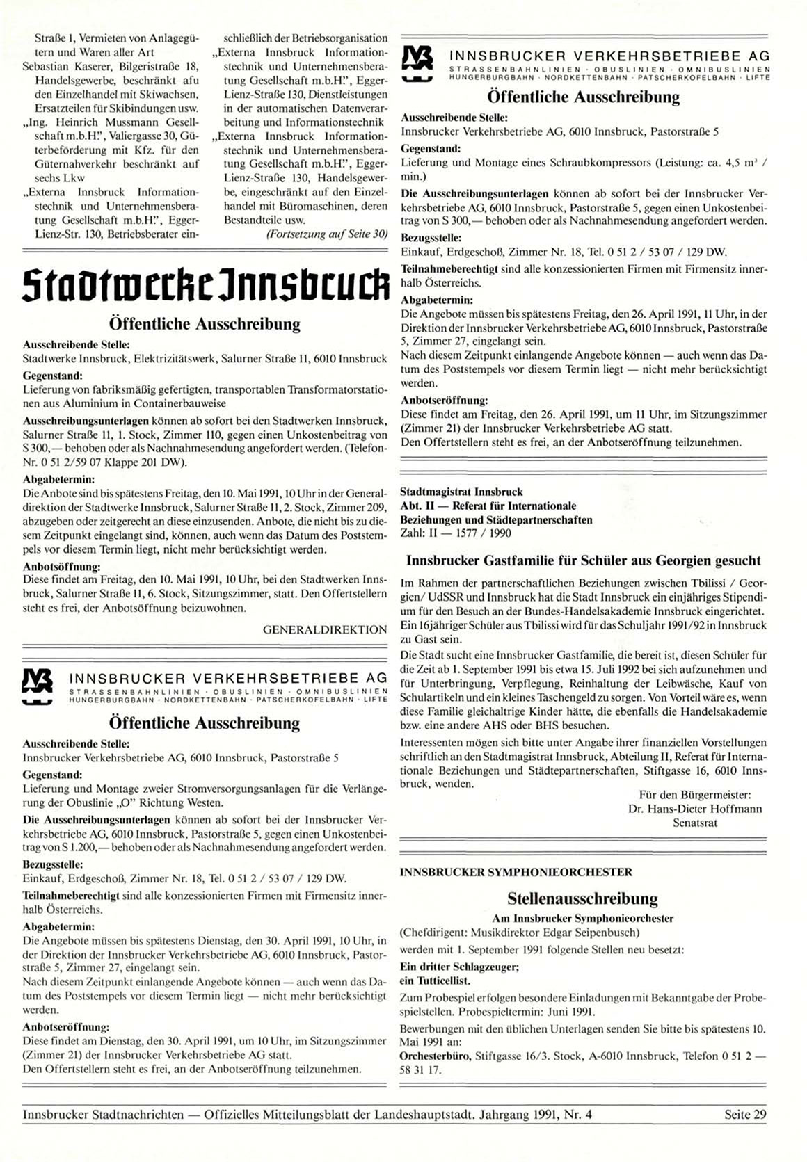 Die Anbote sind bis spätestens Freitag, den 10. Mai 1991, 10 Uhr in der Generaldirektion der Stadtwerke Innsbruck, Salurner Straße 11,2. Stock, Zimmer 209,