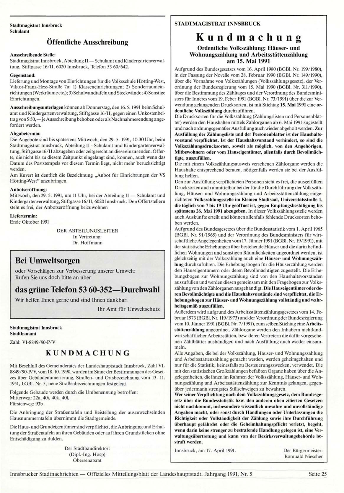 Innsbrucker Stadtnachrichten — Offizielles Mitteilungsblatt der Landeshauptstadt. Jahrgang 1991, Nr. 5