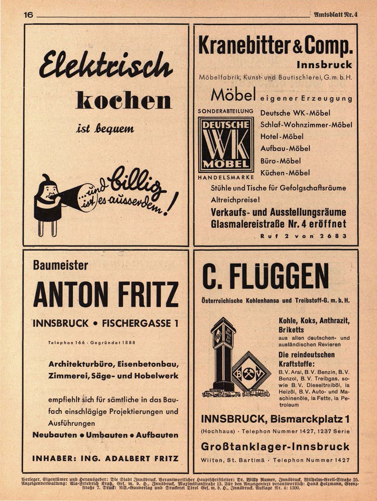 Anzeigenverwaltung: Ala-Friedrich Kratz, Ges. m. b. H., Innsbruck, Maximilianstraße 13. Für den Anzeigentezt verantwortlich: Hans Holzmann, Grenzstraße 7. Drucl: NS.-Gauverlag und Druckerei Tirol Ges. m. b. H., Innsbruck. Auflage Nr. 4: 130U.