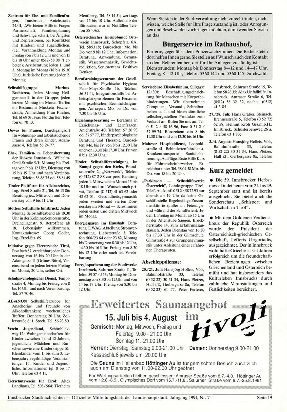 Innsbrucker Stadtnachrichten — Offizielles Mitteilungsblatt der Landeshauptstadt. Jahrgang 1991, Nr. 7