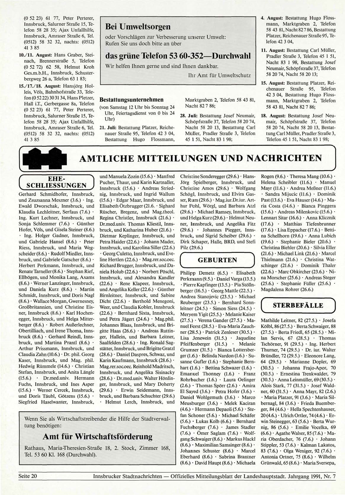 Innsbrucker Stadtnachrichten — Offizielles Mitteilungsblatt der Landeshauptstadt. Jahrgang 1991, Nr. 7