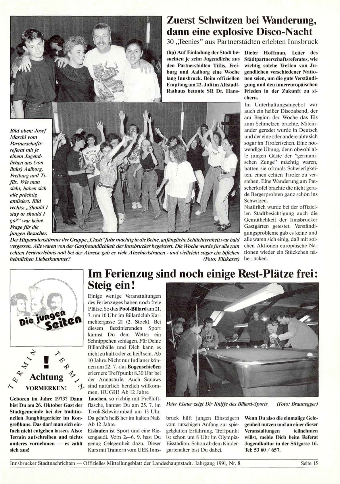 Der Hitparadenstürmer der Gruppe „Clash "fuhr mächtig in die Beine, anfängliche Schüchternheit war bald alle waren sich einig, daß mit solvergessen. A lie waren von der Gastfreundlichkeit der Innsbrucker begeistert. Die Woche wurde für alle zum chen Aktionen europäische Naechten Ferienerlebnis und bei der Abreise gab es viele Abschiedstränen - und vielleicht sogar ein bißchen tionen wieder ein Stückchen näheimlichen Liebeskummer?