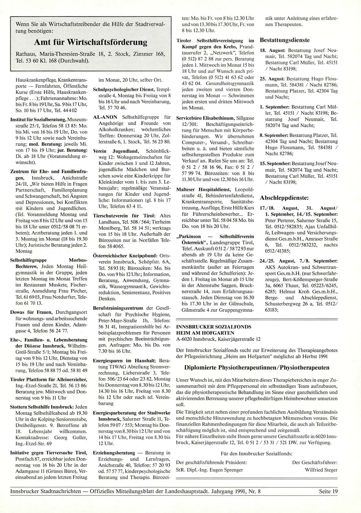 Innsbrucker Stadtnachrichten — Offizielles Mitteilungsblatt der Landeshauptstadt. Jahrgang 1991, Nr. 8