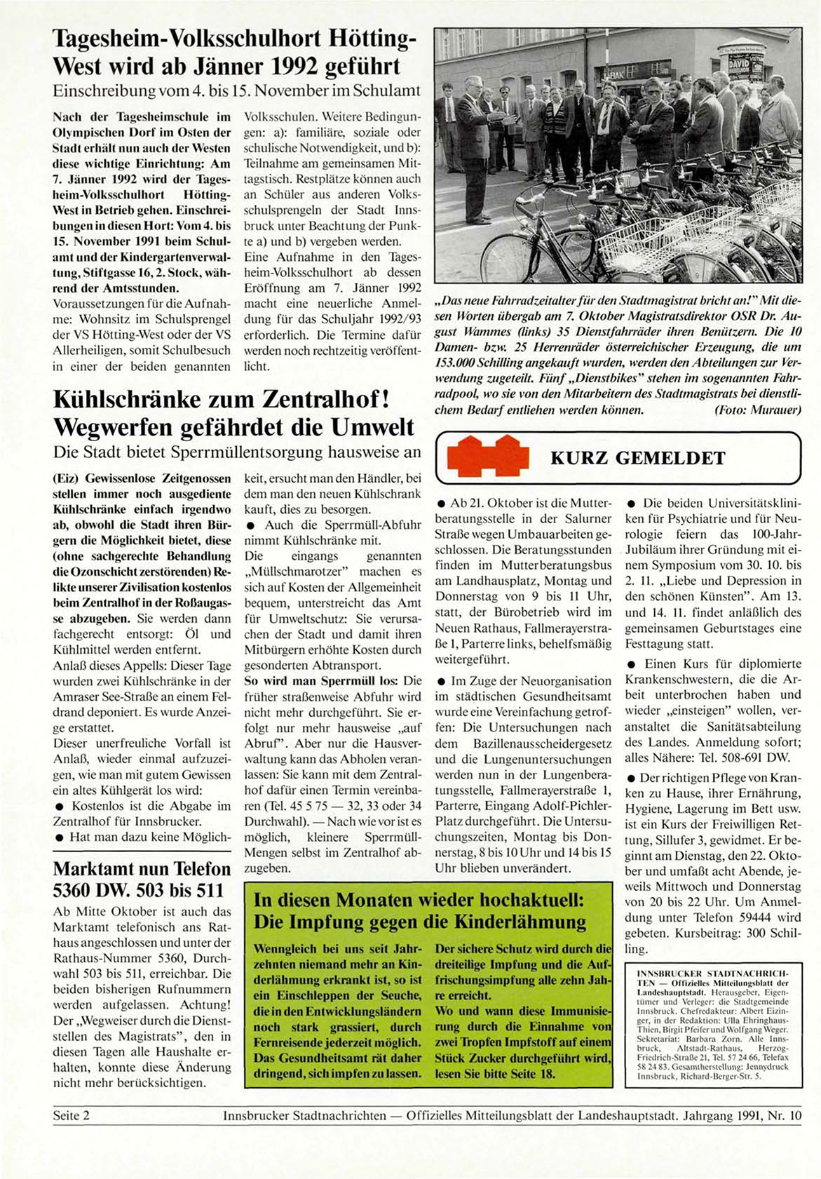 Innsbrucker Stadtnachrichten — Offizielles Mitteilungsblatt der Landeshauptstadt. Jahrgang 1991, Nr. 10