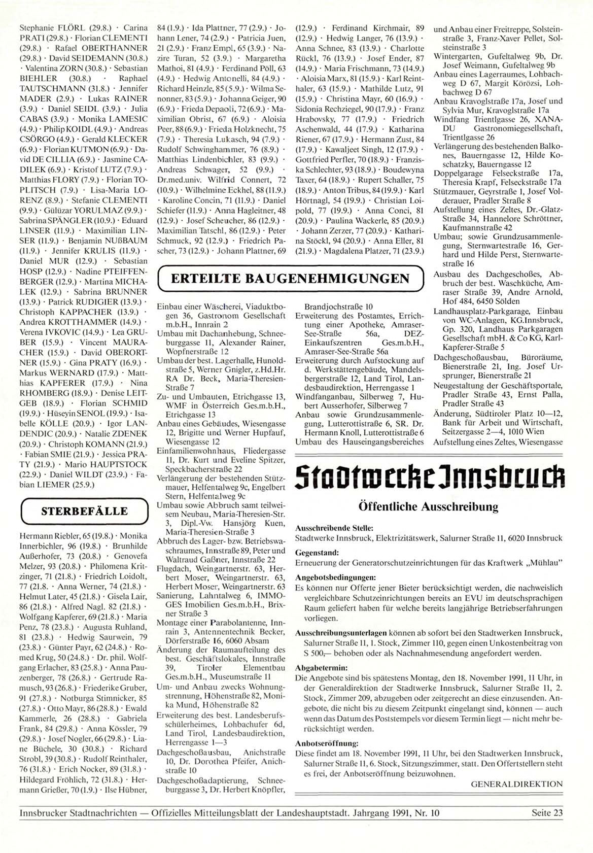 Innsbrucker Stadtnachrichten — Offizielles Mitteilungsblatt der Landeshauptstadt. Jahrgang 1991, Nr. 10