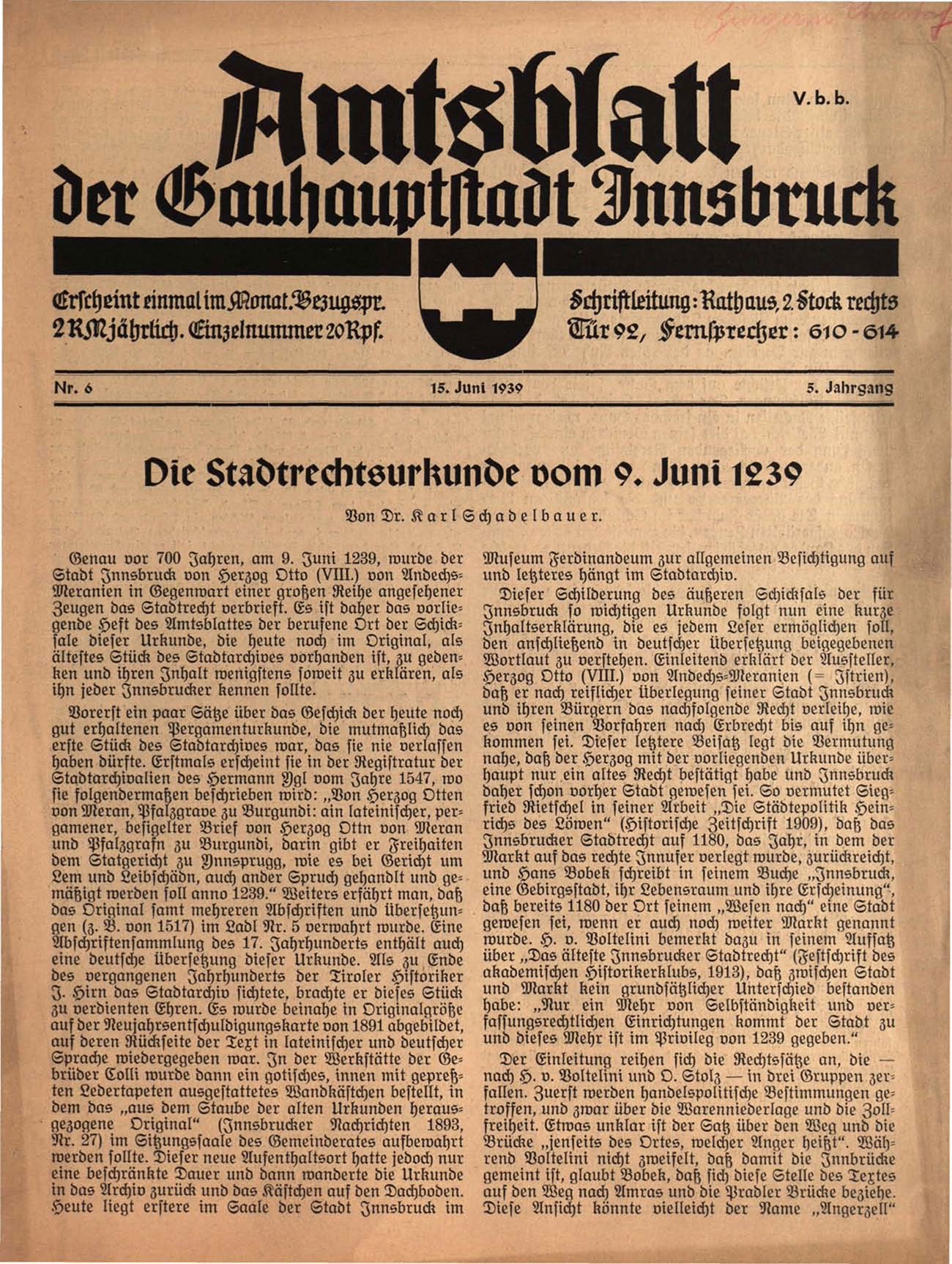 Zeugen das Stadtrecht verbrieft. Es ist daher das vorliegende Heft des Amtsblattes der berufene Ort der Schicksale dieser Urkunde, die heute noch im Original, als