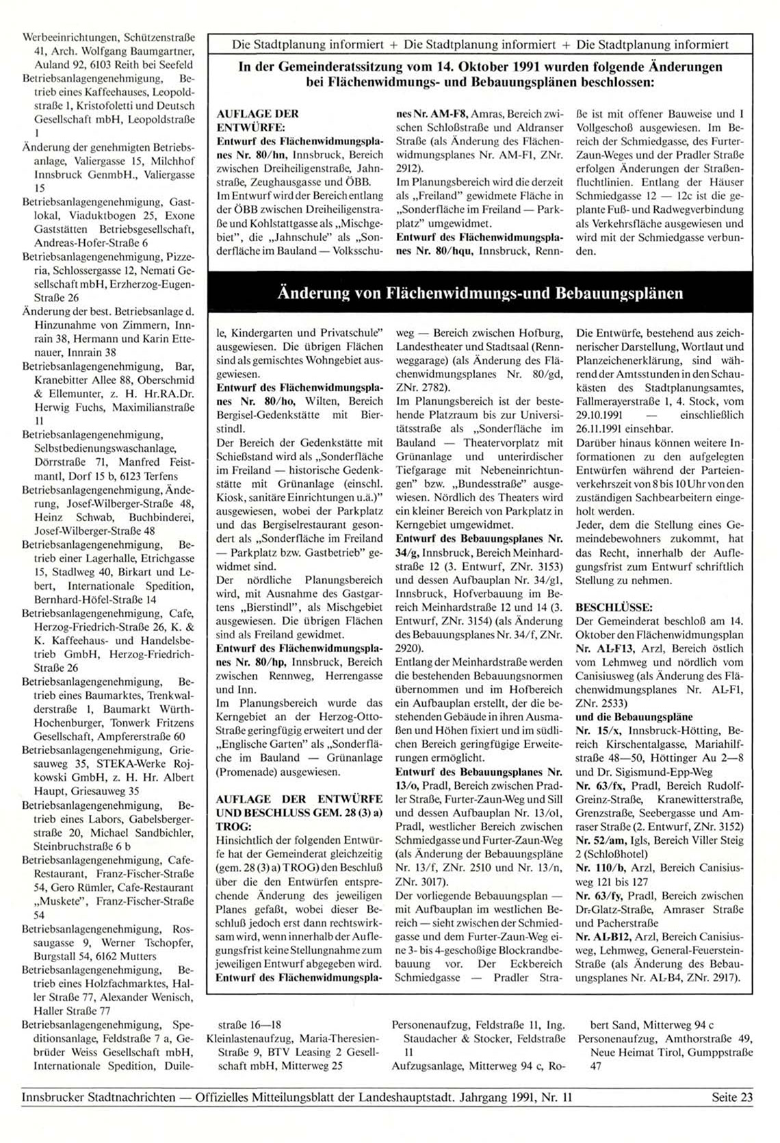 Innsbrucker Stadtnachrichten — Offizielles Mitteilungsblatt der Landeshauptstadt. Jahrgang 1991, Nr. 11