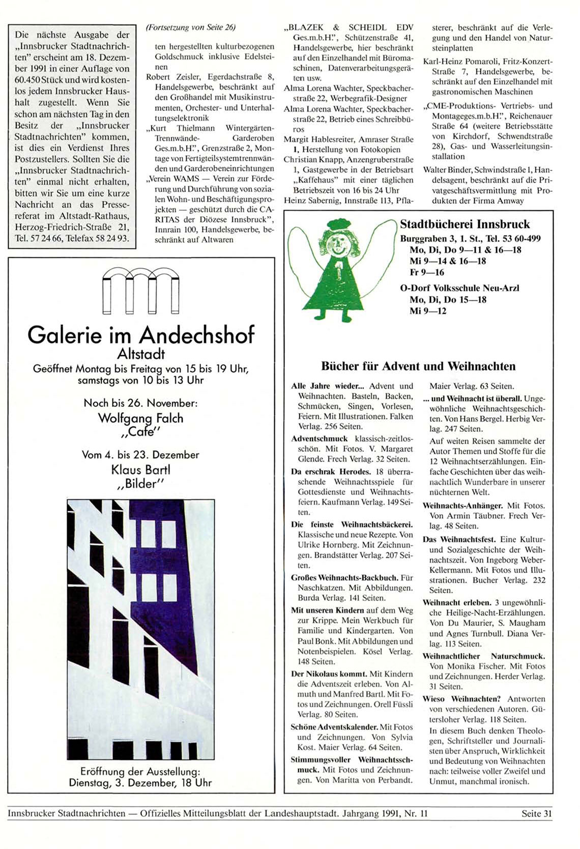 Innsbrucker Stadtnachrichten — Offizielles Mitteilungsblatt der Landeshauptstadt. Jahrgang 1991, Nr. 11