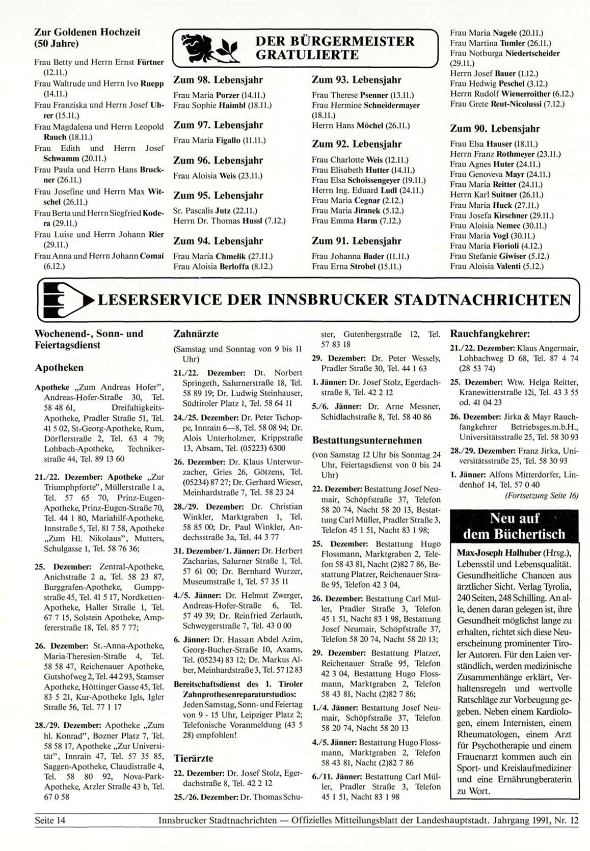 Innsbrucker Stadtnachrichten — Offizielles Mitteilungsblatt der Landeshauptstadt. Jahrgang 1991, Nr. 12