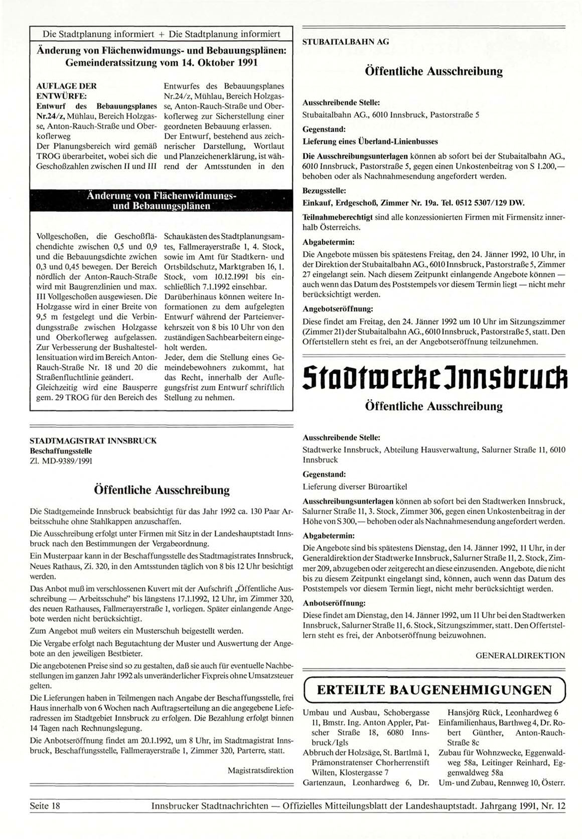 Innsbrucker Stadtnachrichten — Offizielles Mitteilungsblatt der Landeshauptstadt. Jahrgang 1991, Nr. 12