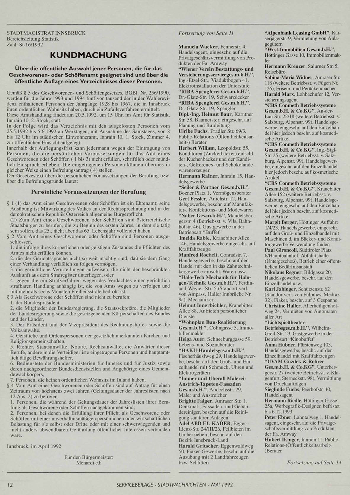 werden für die Jahre 1993 und 1994 fünf von tausend der in der Wählerevidenz enthaltenen Personen der Jahrgänge 1928 bis 1967, die in Innsbruck