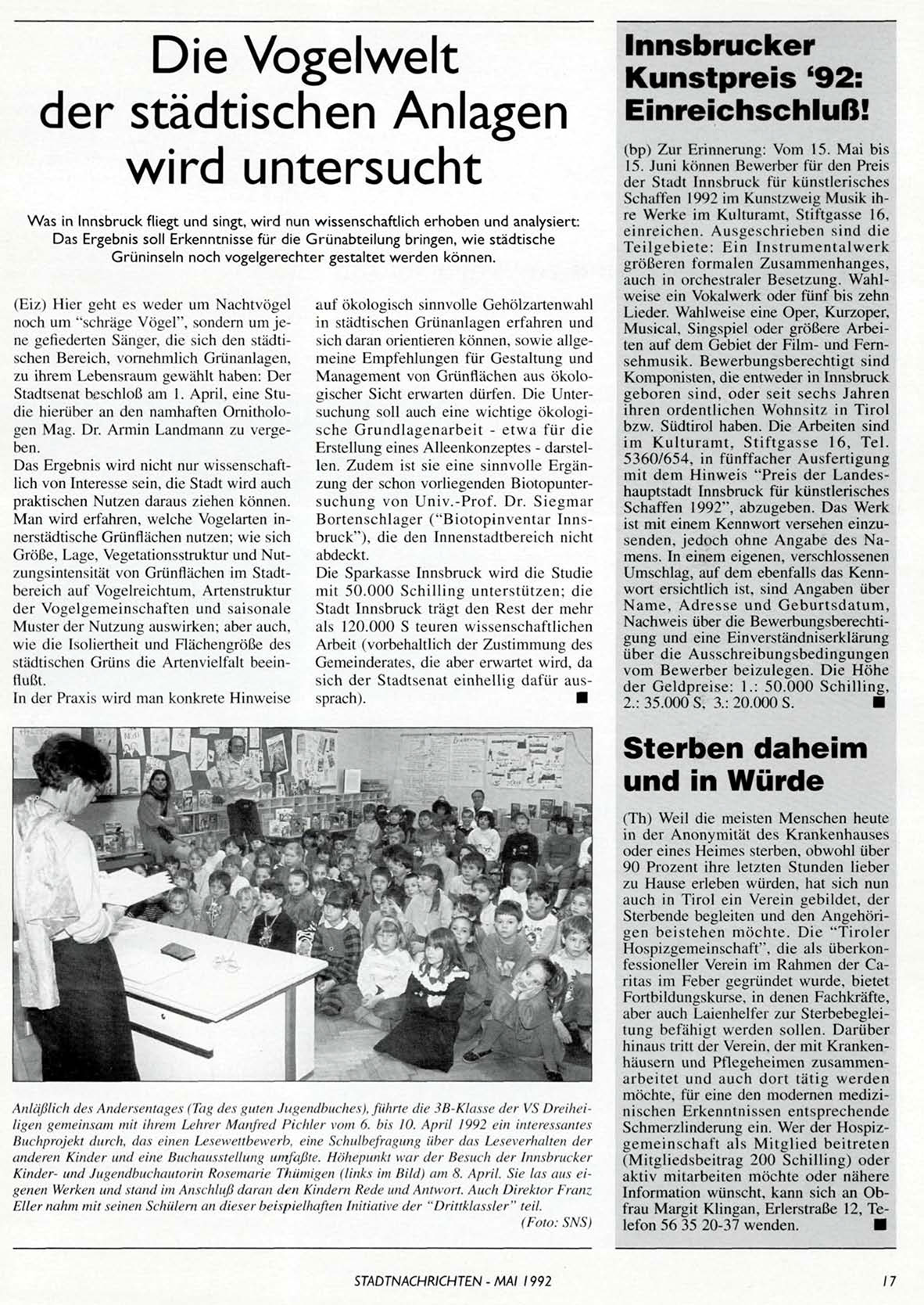 Stadtsenat beschloß am 1. April, eine Studie hierüber an den namhaften Ornithologen Mag. Dr. Armin Landmann zu vergeben.