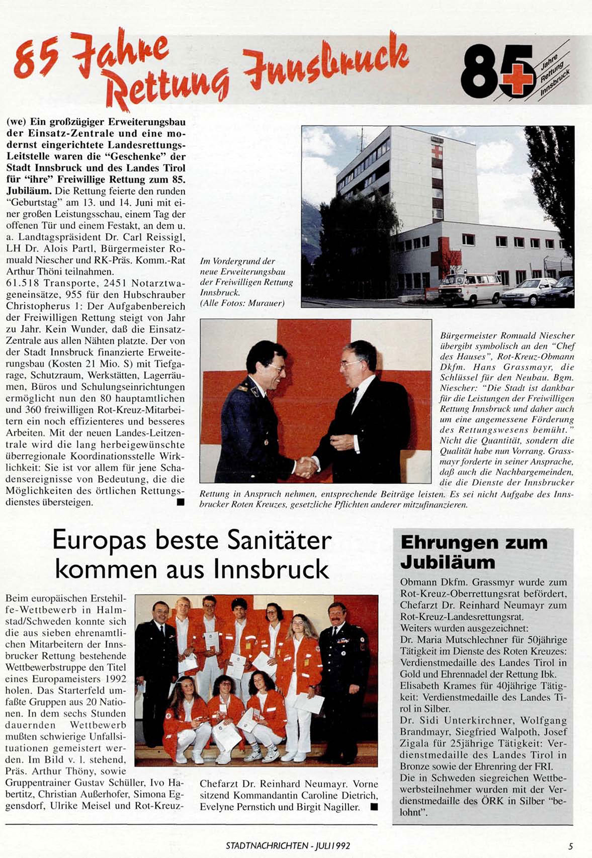 der Stadt Innsbruck finanzierte Erweiterungsbau (Kosten 21 Mio. S) mit Tiefgarage, Schutzraum, Werkstätten, Lagerräumen, Büros und Schulungseinrichtungen