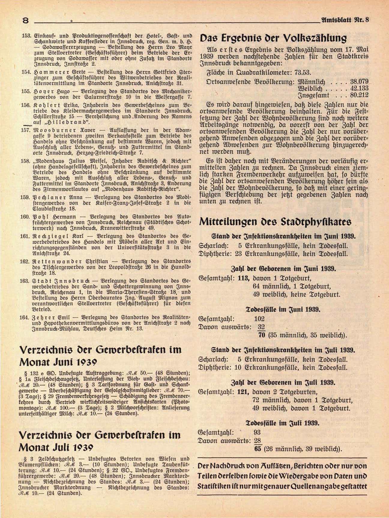 Es ist daher noch mit Veränderungen der vorläufig ermittelten Zahlen zu rechnen. Da Innsbruck einen ziemlich starken Fremdenverkehr aufzuweisen hat, so dürfte