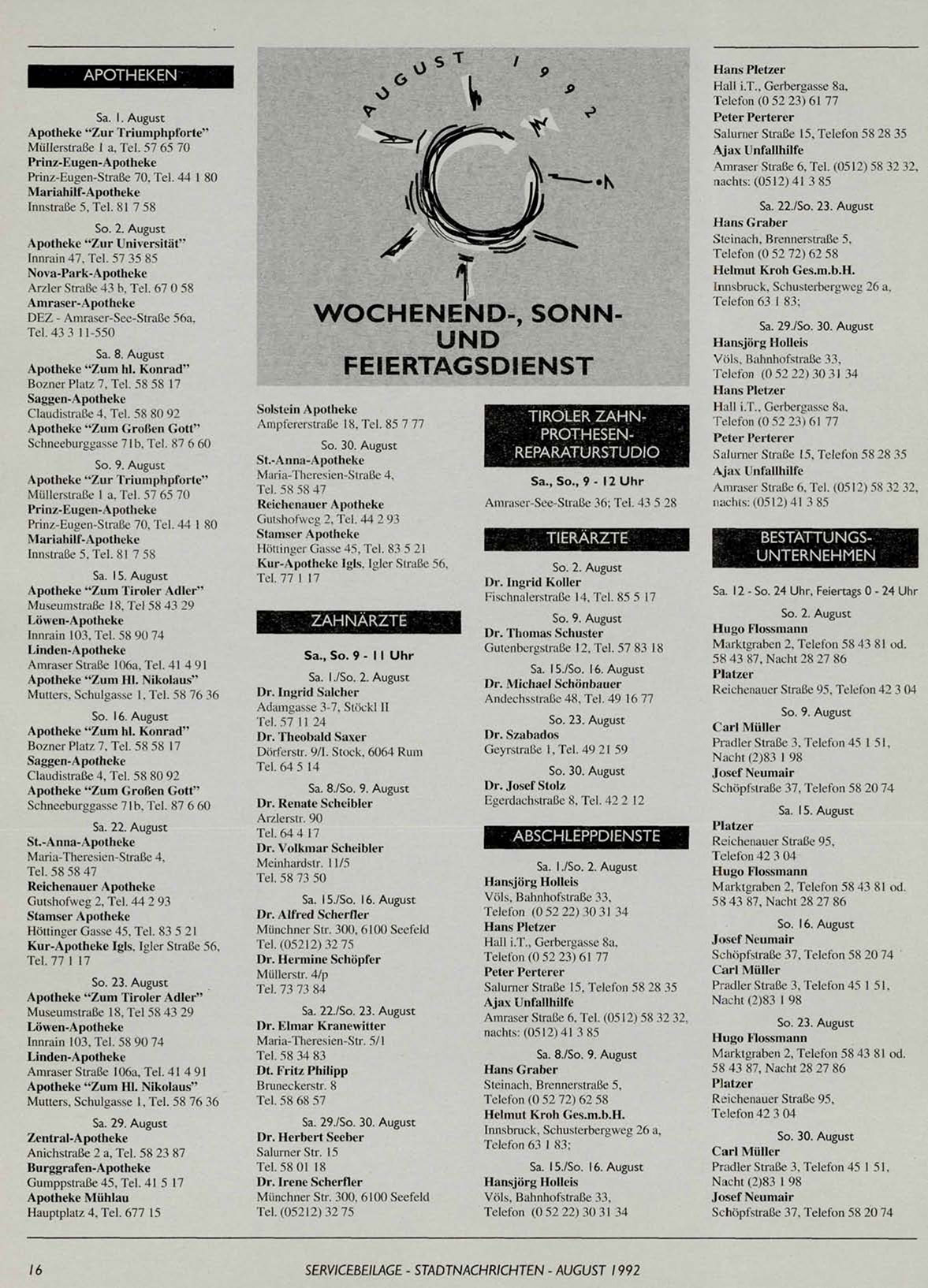 SERVICEBEILAGE - STADTNACHRICHTEN - AUGUST 1992