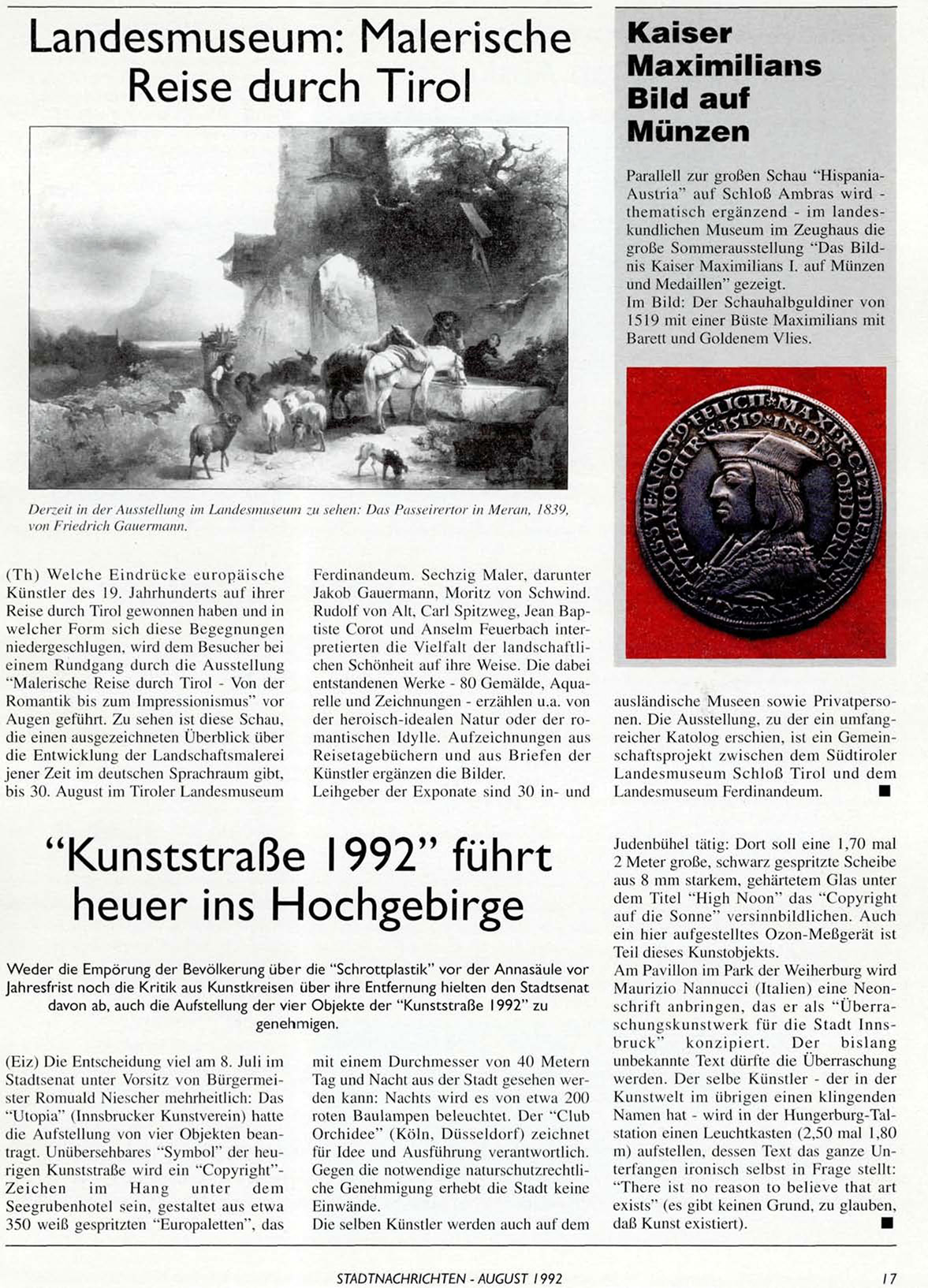 davon ab, auch die Aufstellung der vier Objekte der "Kunststraße 1992" zu