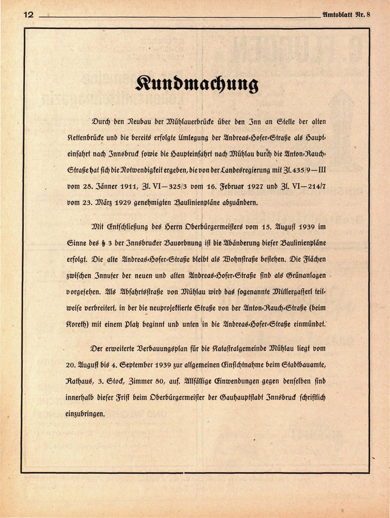 Kettenbrücke und die bereits erfolgte llmlegung der Andreas-Oofer-Straße als Haupteinfahrt nach Innsbruck sowie die Haupteinfahrt nach Mühlau duröh die An^on-Rauch«