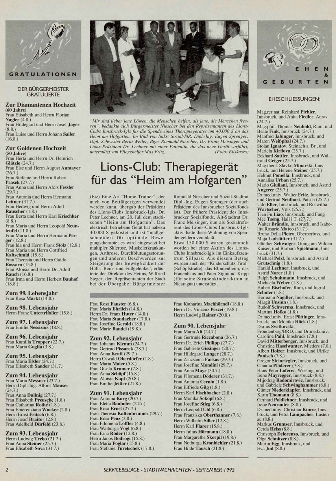 "Mir sind lieber jene Löwen, die Menschen helfen, als jene, die Menschen fressen", bedankte sich Bürgermeister Niescher bei den Repräsentanten des LionsClubs Innsbruck-Igls für die Spende eines Therapiegerätes um 40.000 S an das