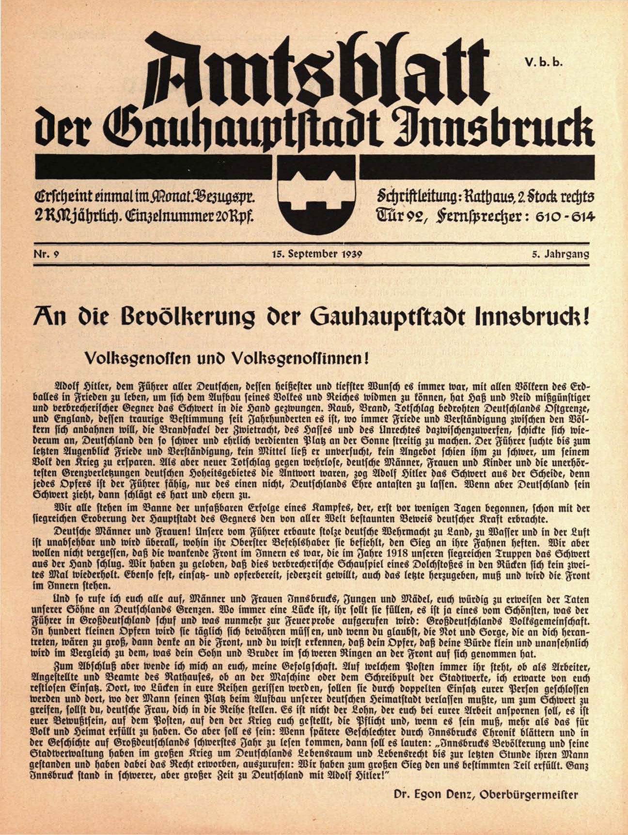 der Geschichte auf Großdeutschlands schwerstes Jahr zu lesen kommen, dann soll es lauten: «Innsbrucks Bevölkerung und seine
