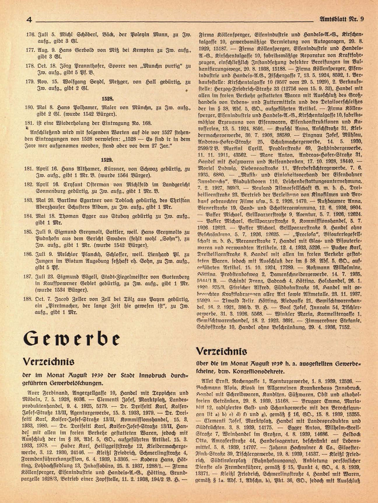 Otto. Amraserstraße 44, Handelsagentur, beschränkt auf Lebensmittel. 5. 8. 1939. 14707. — Johann Hochrainer 6 Co.. SilvesterFink-Straße 39. Tischlergewerbe. 19. 8. 1939. 14537. — Kleißl Friedrich. Südtirolervlatz (Bahnhofausgang), Anbietung persönlicher