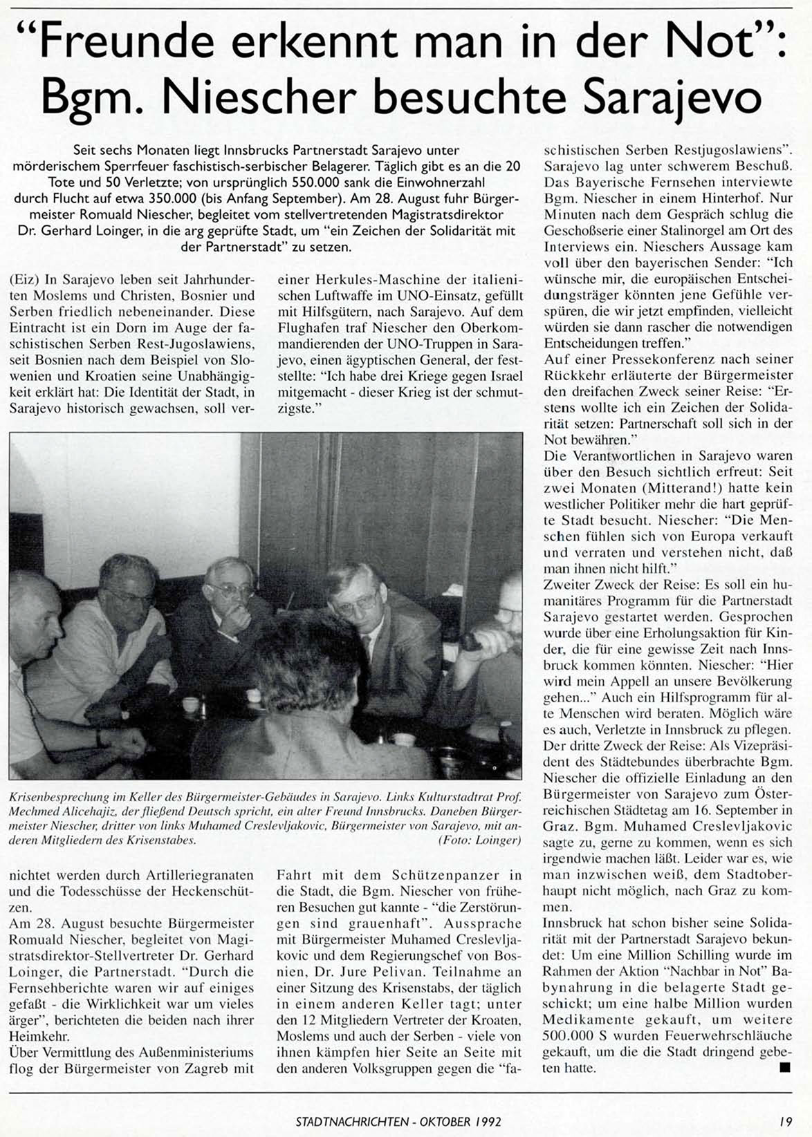 Innsbruck hat schon bisher seine Solidarität mit der Partnerstadt Sarajevo bekundet: Um eine Million Schilling wurde im