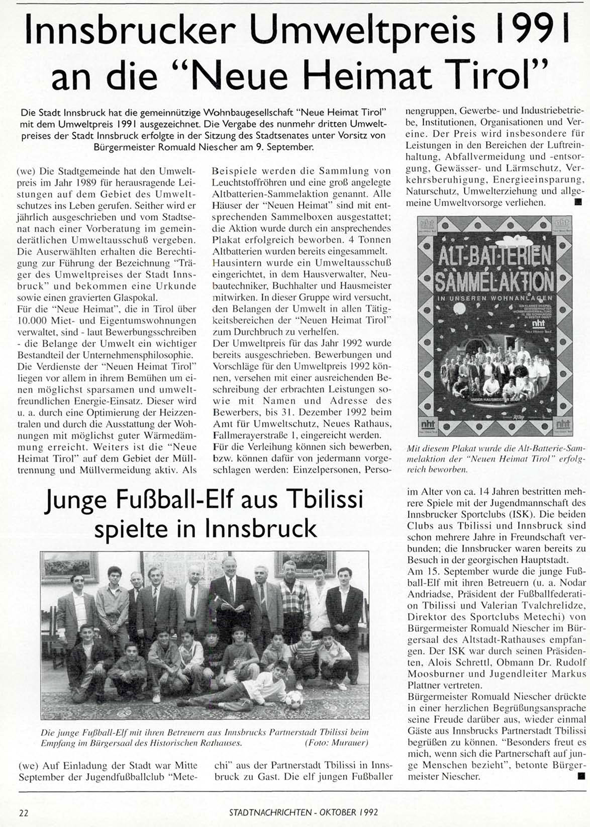 mit dem Umweltpreis 1991 ausgezeichnet. Die Vergabe des nunmehr dritten Umweltpreises der Stadt Innsbruck erfolgte in der Sitzung des Stadtsenates unter Vorsitz von