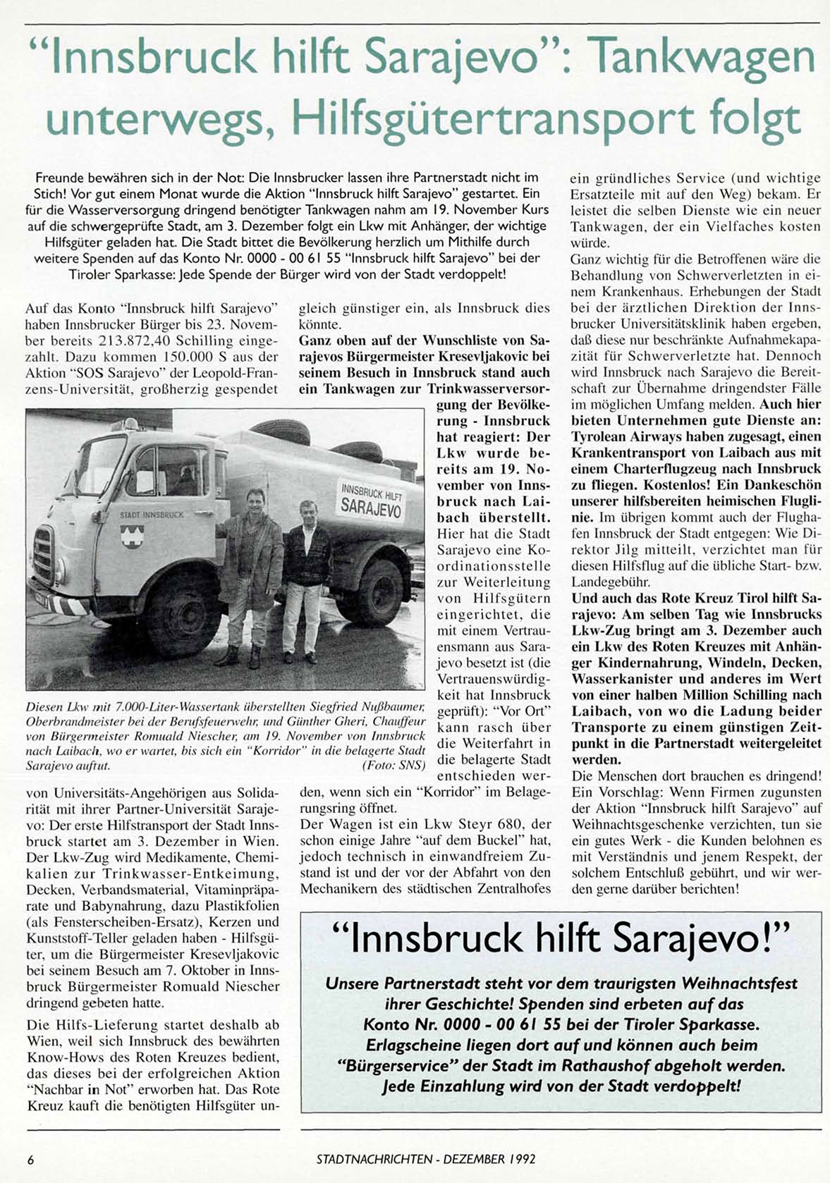 weitere Spenden auf das Konto Nr. 0000 - 00 61 55 "Innsbruck hilft Sarajevo" bei der