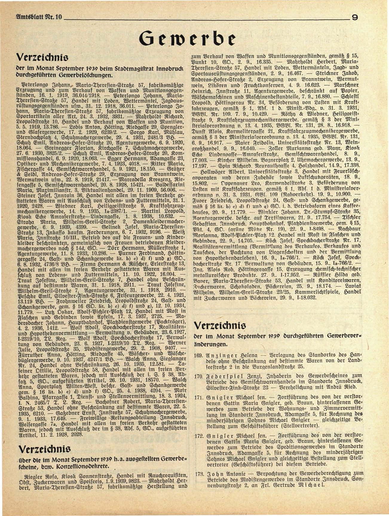 gewerbe. 6. 9. 1939, 4399. — Gelinek Josef, Maria-Theresien- Pkt. 4. GO. larüne Müke Nr. 19). 22. 9.. 1-8498. — Nachbaur