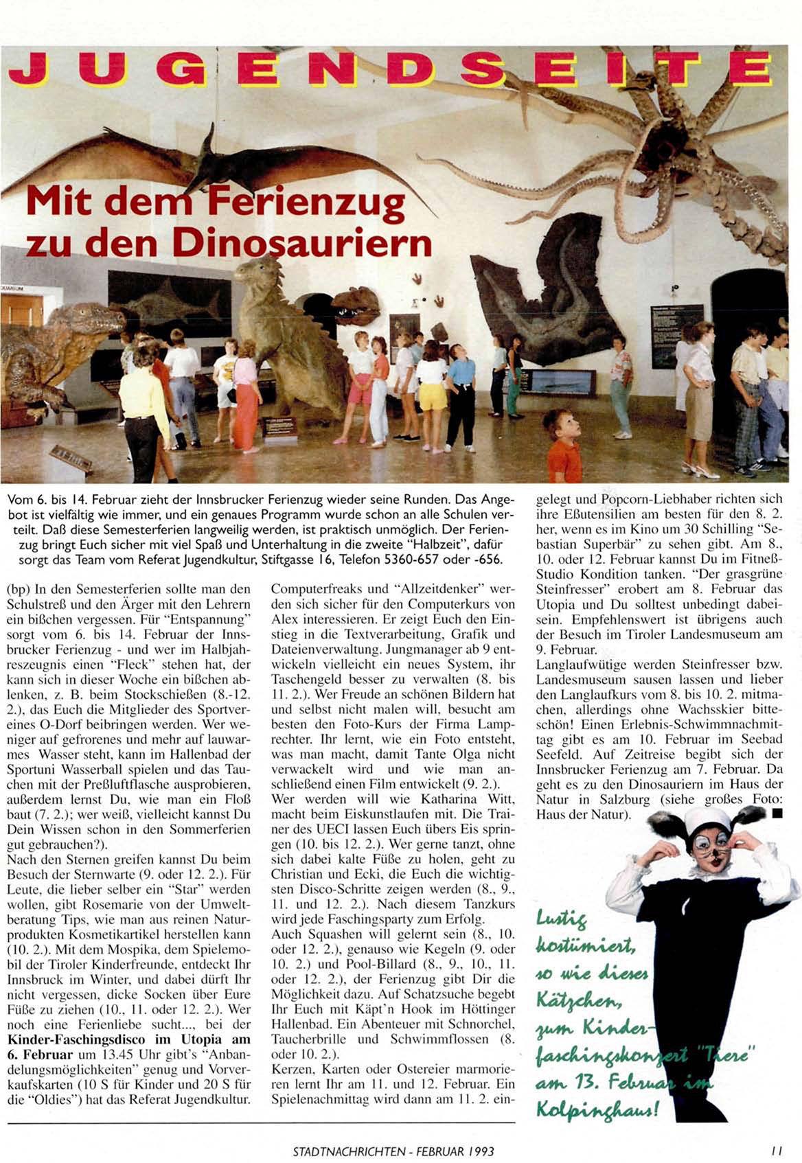 Vom 6. bis 14. Februar zieht der Innsbrucker Ferienzug wieder seine Runden. Das Angebot ist vielfältig wie immer, und ein genaues Programm wurde schon an alle Schulen verteilt. Daß diese Semesterferien langweilig werden, ist praktisch unmöglich. Der Ferienzug bringt Euch sicher mit viel Spaß und Unterhaltung in die zweite "Halbzeit", dafür