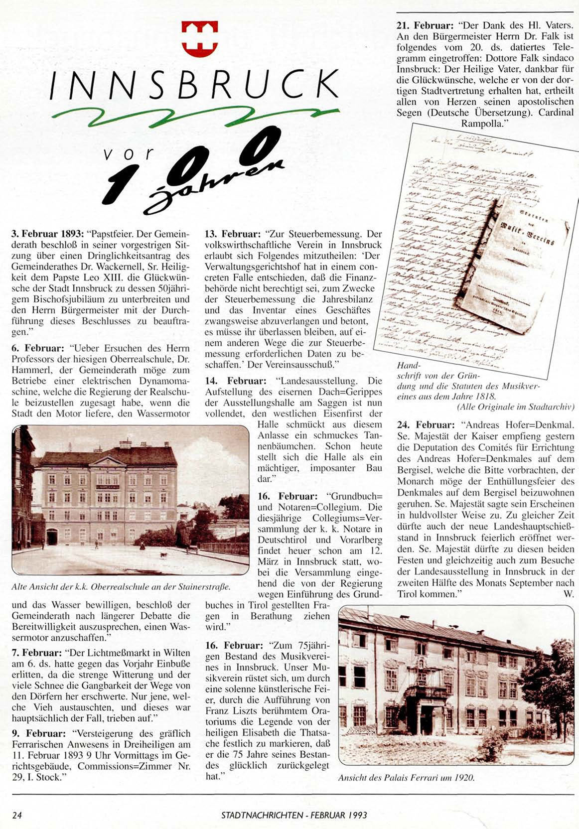 3. F e b r u a r 1893: "Papstfeier. Der Gemeinderath beschloß in seiner vorgestrigen Sitzung über einen Dringlichkeitsantrag des