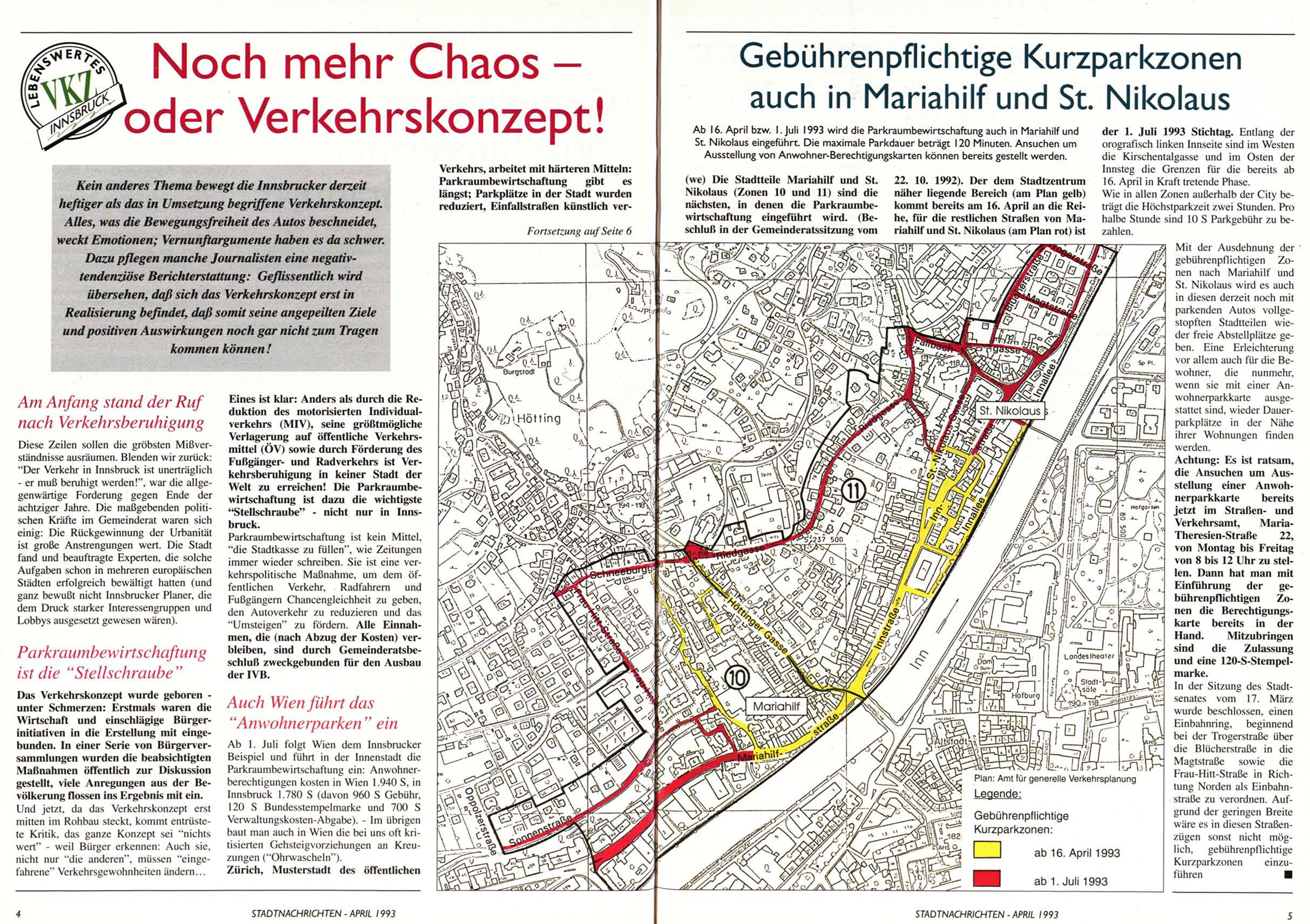 Ab 16. April bzw. I.Juli 1993 wird die Parkraumbewirtschaftung auch in Mariahilf und