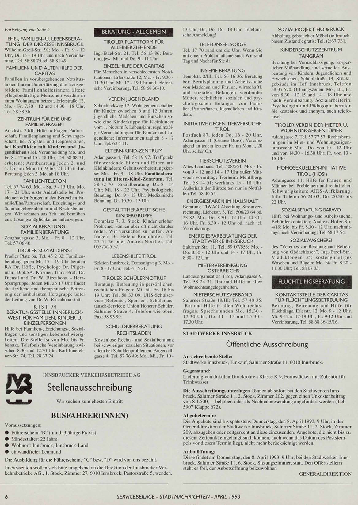 Diese findet am Donnerstag, den 8. April 1993, 9 Uhr, bei den Stadtwerken Innsbruck, Salurner Straße 11,6. Stock, Sitzungszimmer, statt. Den Offertstellern