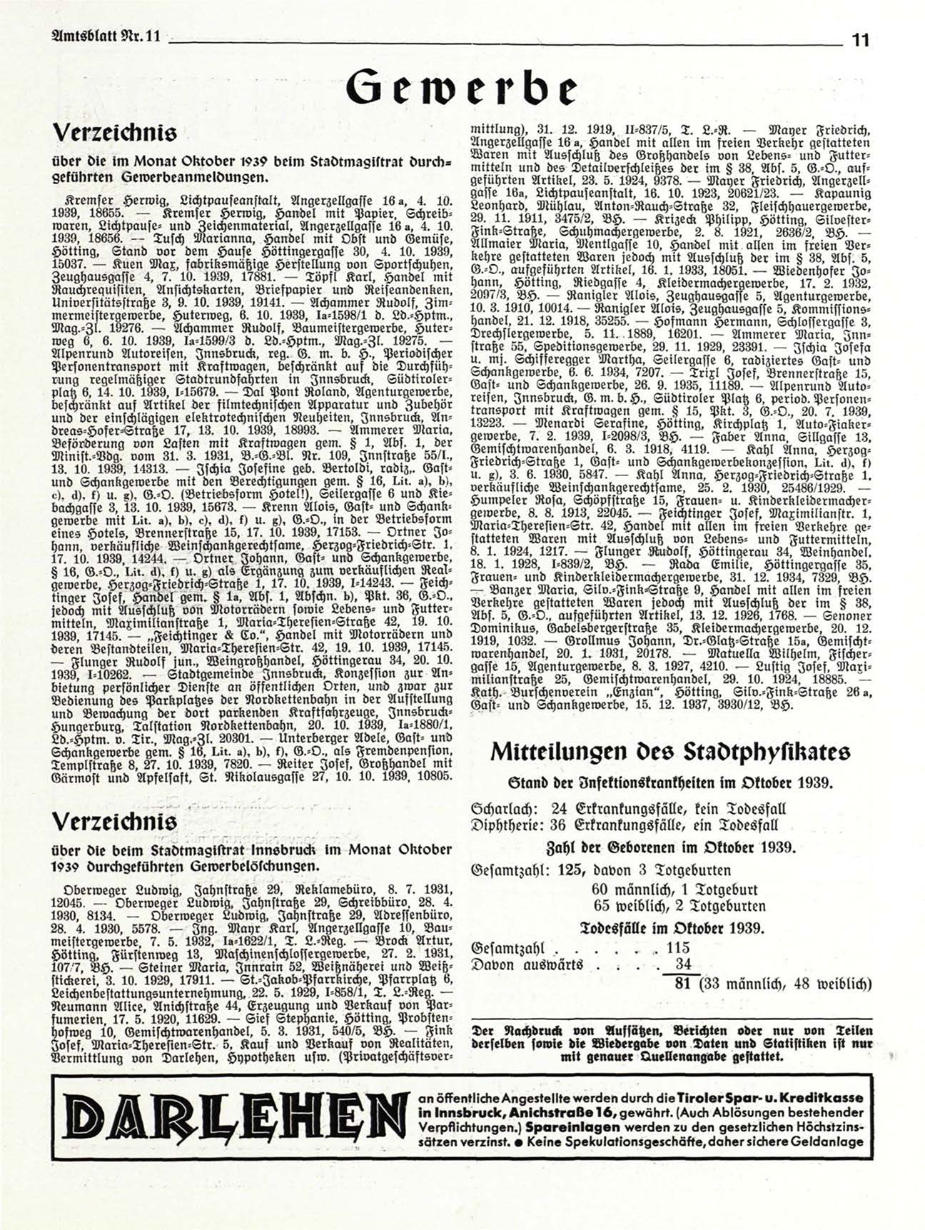 eines Hotels. Brennerstraße 15. 17. 10. 1939. 17153. — Ortner Johann, verkäufliche Weinschankgerechtsame. Herzog-Friedrich-Str. 1.