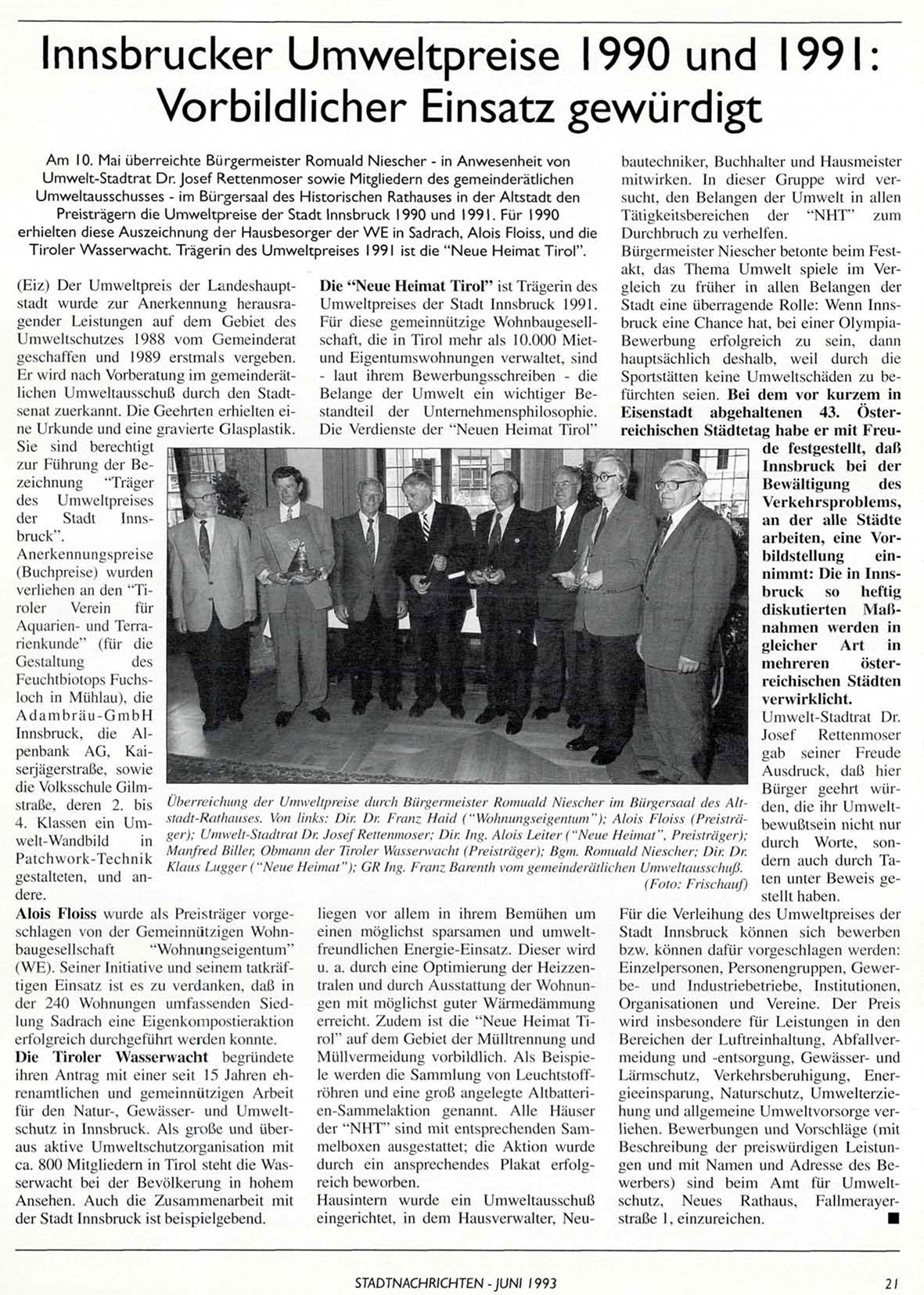 Preisträgern die Umweltpreise der Stadt Innsbruck 1990 und 1991. Für 1990