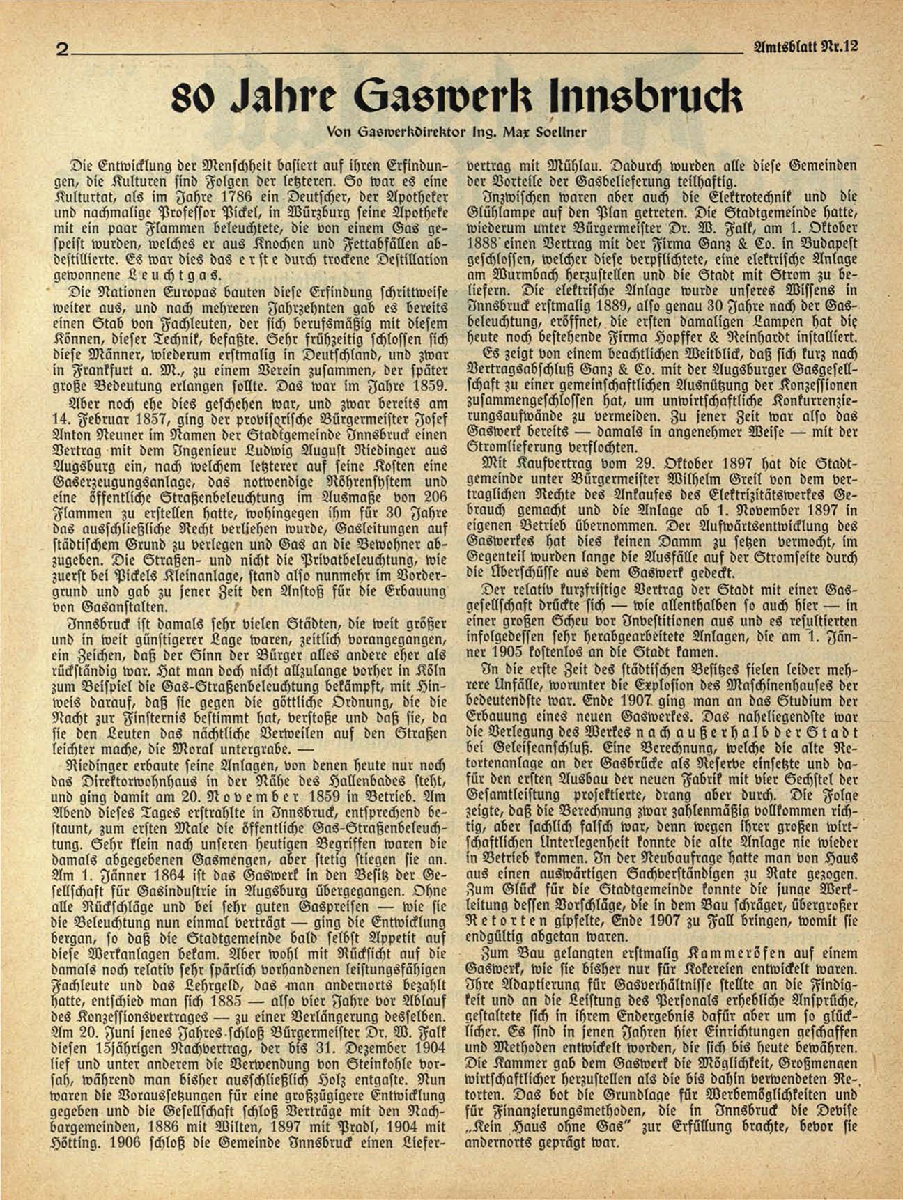 Abend dieses Tages erstrahlte in Innsbruck, entsprechend bestaunt, Zum ersten Male die öffentliche Gas-Straßenbeleuchtung. Sehr klein nach unseren heutigen Begriffen waren die