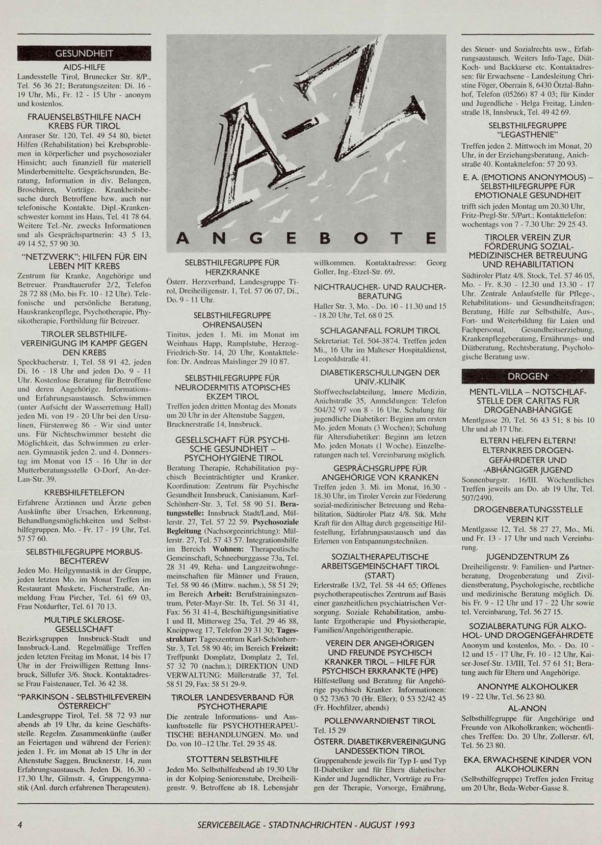 Gesundheit Innsbruck, Canisianum, KarlSchönherr-Str. 3, Tel. 58 90 51. Beratungsstelle: Innsbruck Stadt/Land, Mallerstr. 27, Tel, 57 22 59. Psychosoziale